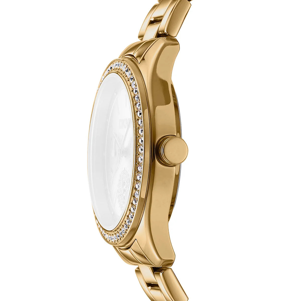 Профил на дамски часовник DKNY Evening – златист корпус 38 мм и безел с кристали, модел DK1L129M0055