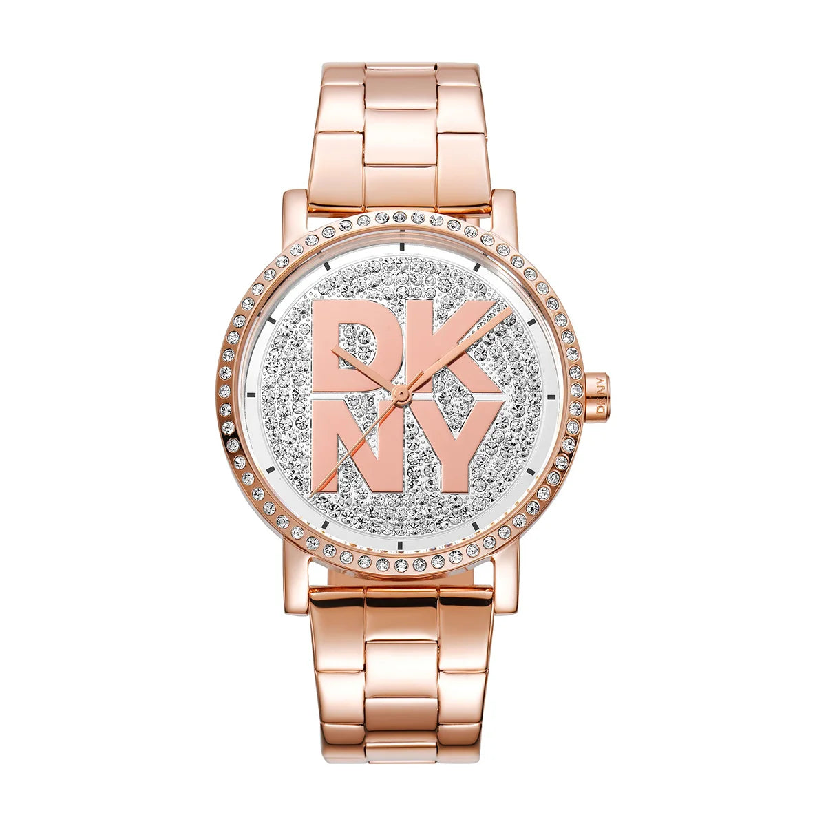 Дамски часовник DKNY Soho Logo, розовозлатиста стомана с кристален безел и циферблат „паве“ – часовник DKNY модел DK1L035M0225