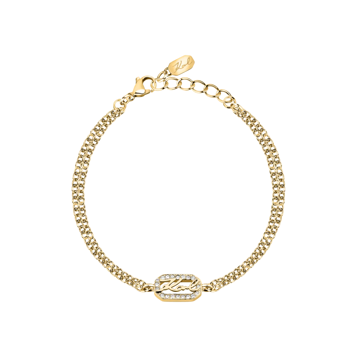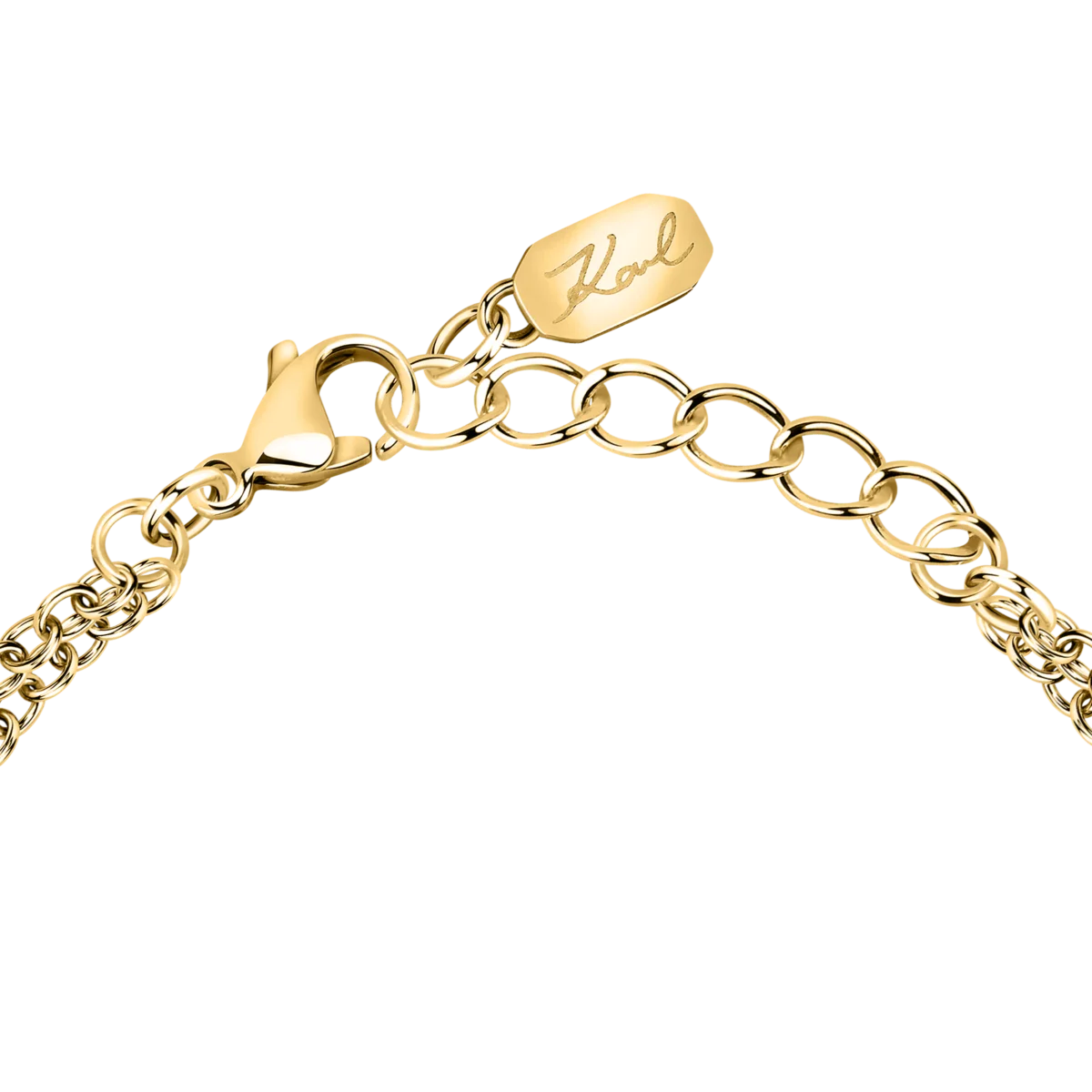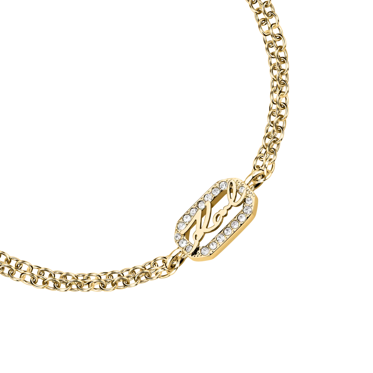 Нежна, но забележима, тази дамска гривна Karl Lagerfeld Crystals е създадена да бъде всекидневен лукс. Двойната златиста верижка обгръща китката като фино плетено въже, а в центъра блести правоъгълен елемент с логото Karl, рамкирано от бели кристали.