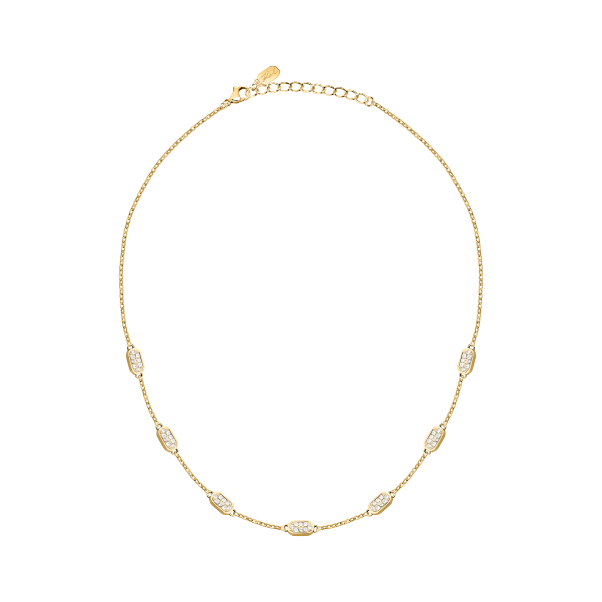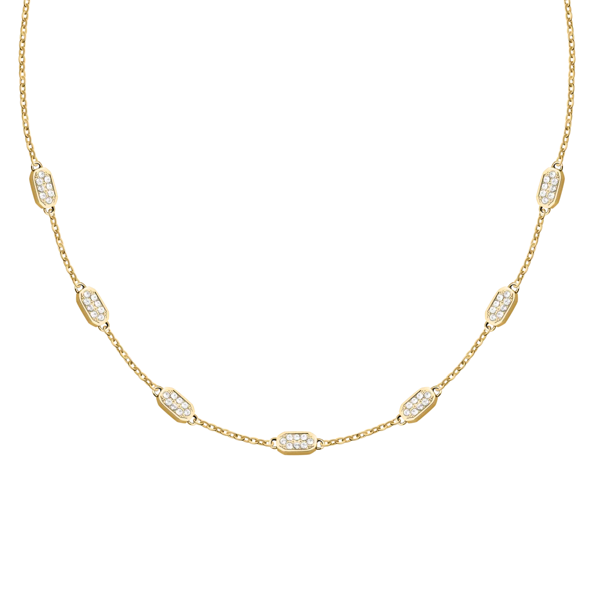 Колие от колекция Karl Lagerfeld Crystals, изработено от неръждаема стомана 316L с PVD покритие в цвят жълто злато. Материалът е устойчив на износване и потъмняване, а гланцираната повърхност подчертава луксозния характер на модела. Дискретните кристални елементи са равномерно разпределени по веригата, така че колието изглежда елегантно както соло, така и в комбинация с други бижута.