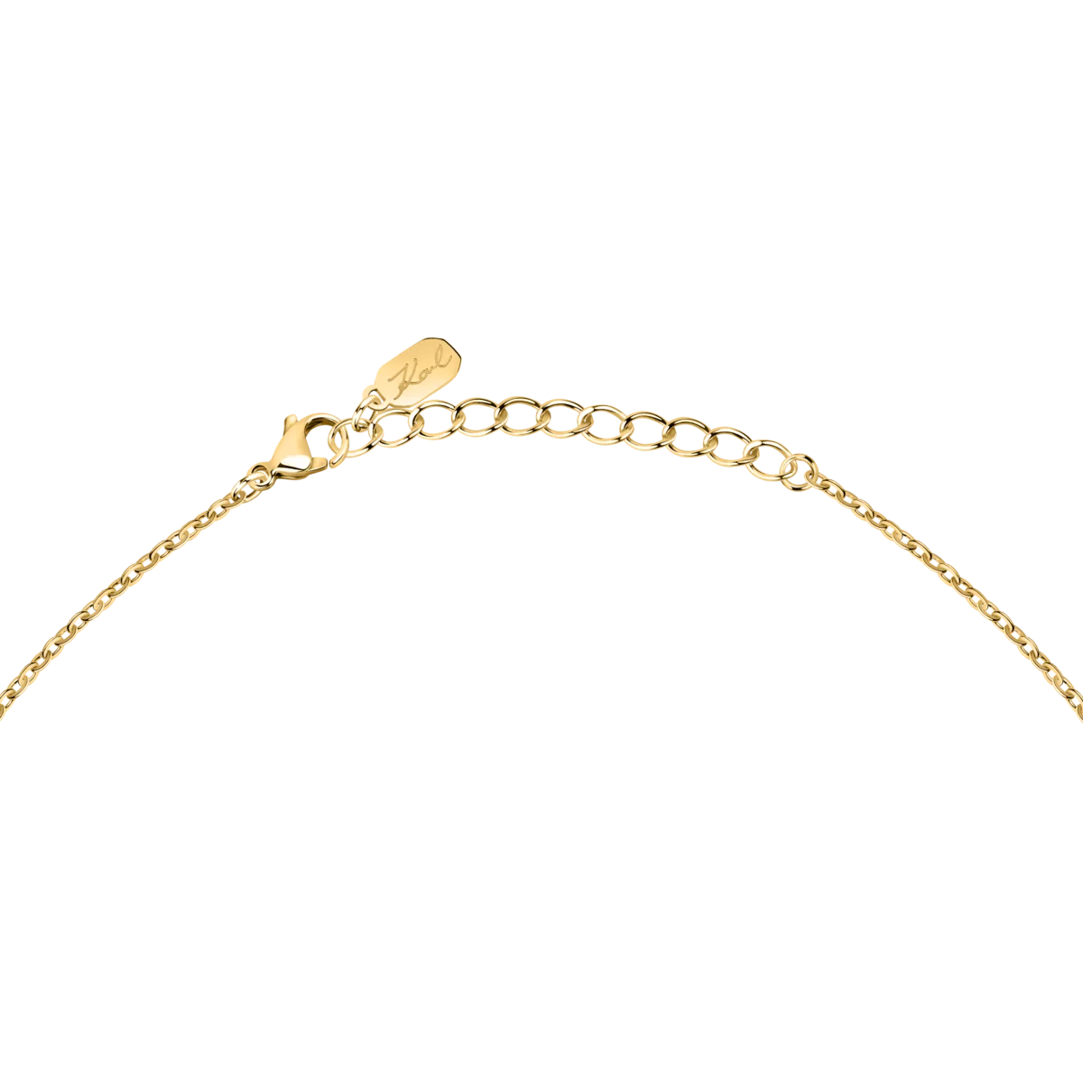 Закопчаване тип карабинер и удължител с плочка с подпис Karl на златисто колие Crystals – модел KLAYC58