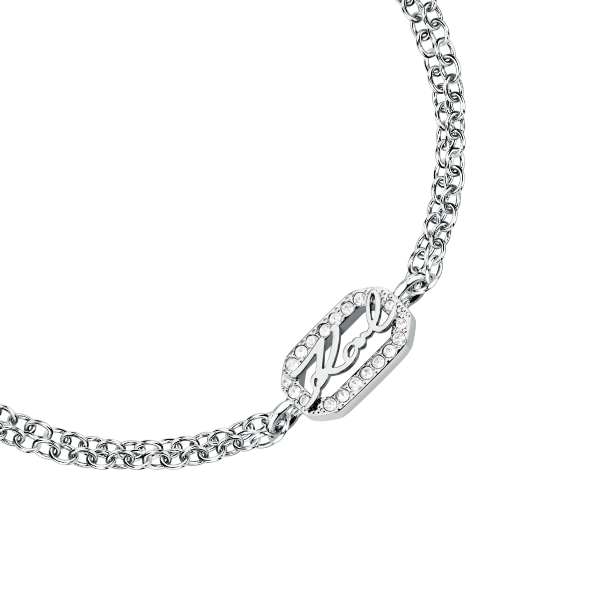 Дамската гривна Karl Lagerfeld Crystals KLAYC33 е фин, но впечатляващ акцент, който добавя блясък към всеки аутфит. Двойната сребриста верижка деликатно приляга около китката, а в центъра стои правоъгълен елемент с изрязан надпис „Karl“, обрамчен от ред бели кристали.