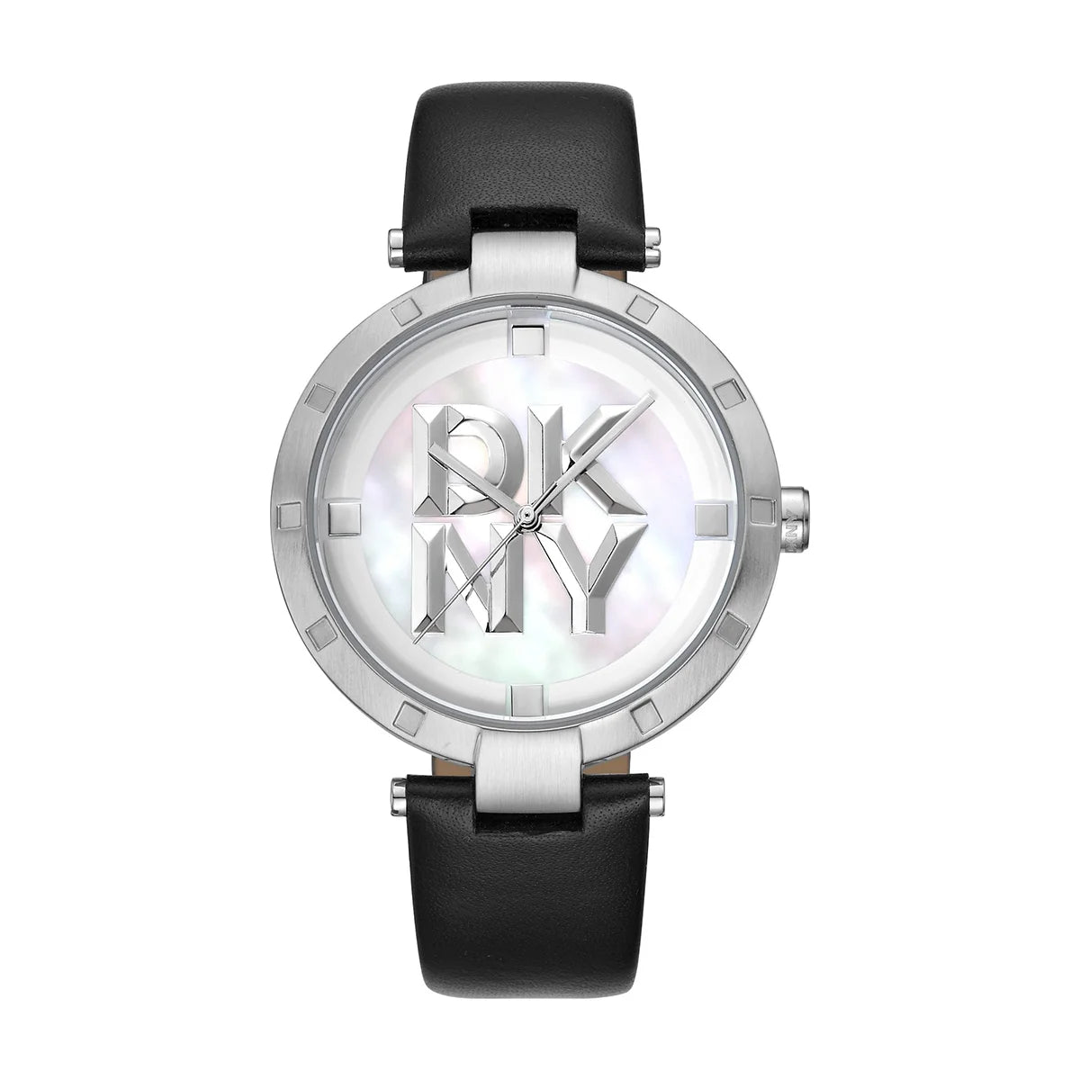Дамски часовник DKNY Logo – бял седефен циферблат, черна кожена каишка, 38 мм; часовник DKNY модел DK1L041L0015