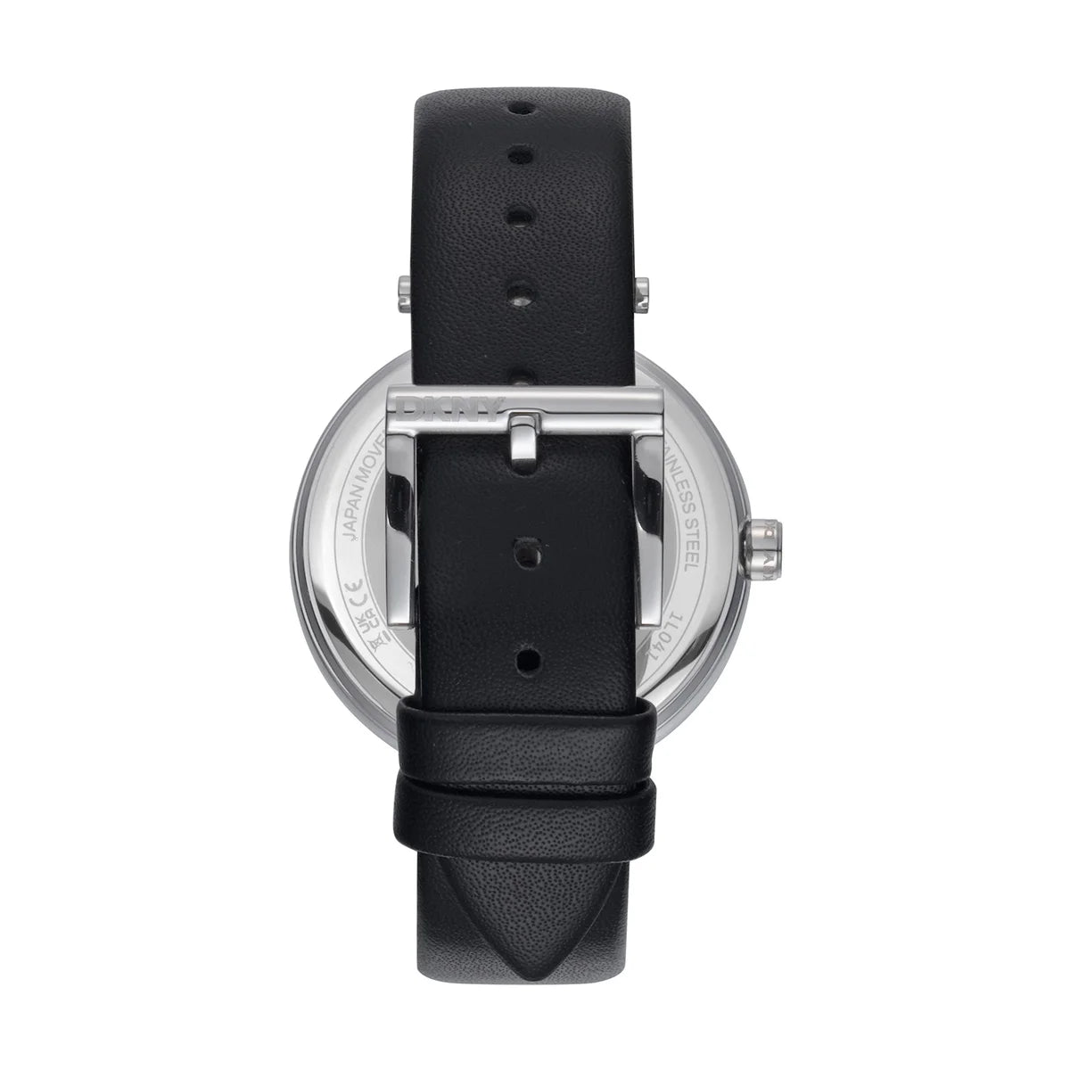Гръб на дамски часовник DKNY Logo – черна кожена каишка с класическа тока, модел DK1L041L0015
