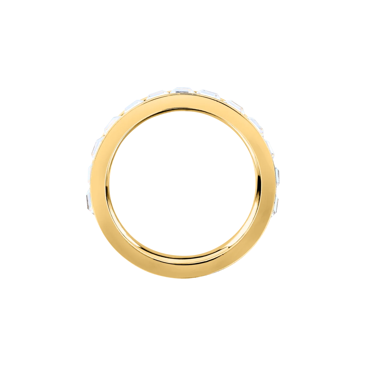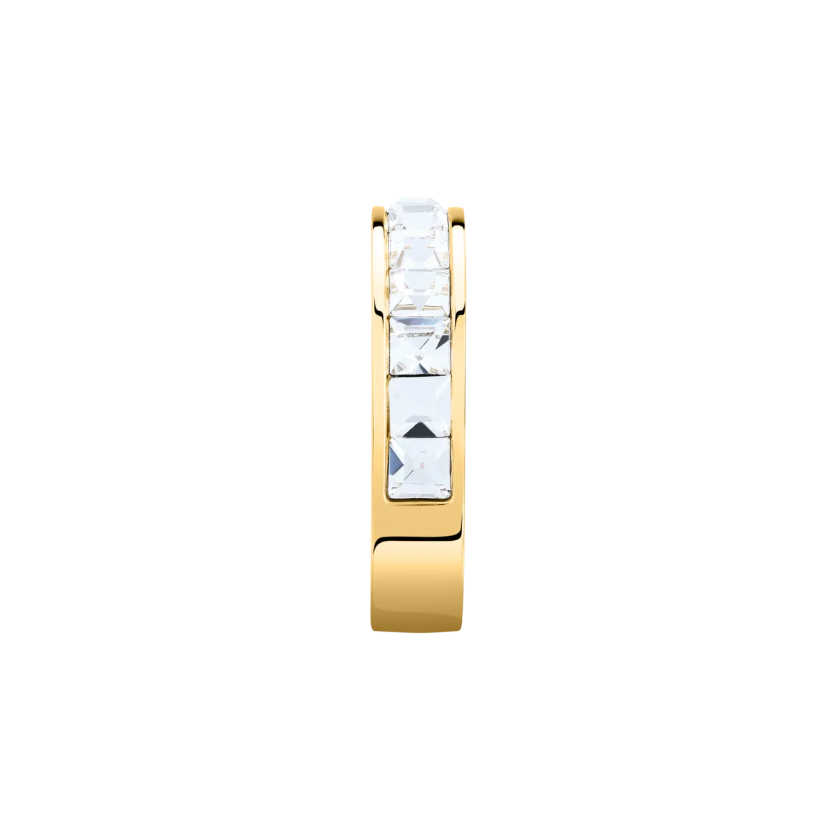 Бижуто е изработено от неръждаема стомана със златисто йонно покритие (IP), което запазва цвета и блясъка дълго време и е по-устойчиво на надраскване от обикновеното боядисване. В канал по ръба на халката са подредени прозрачни квадратни кристали, напомнящи фасети на диаманти – за сияние, което не остава незабелязано.