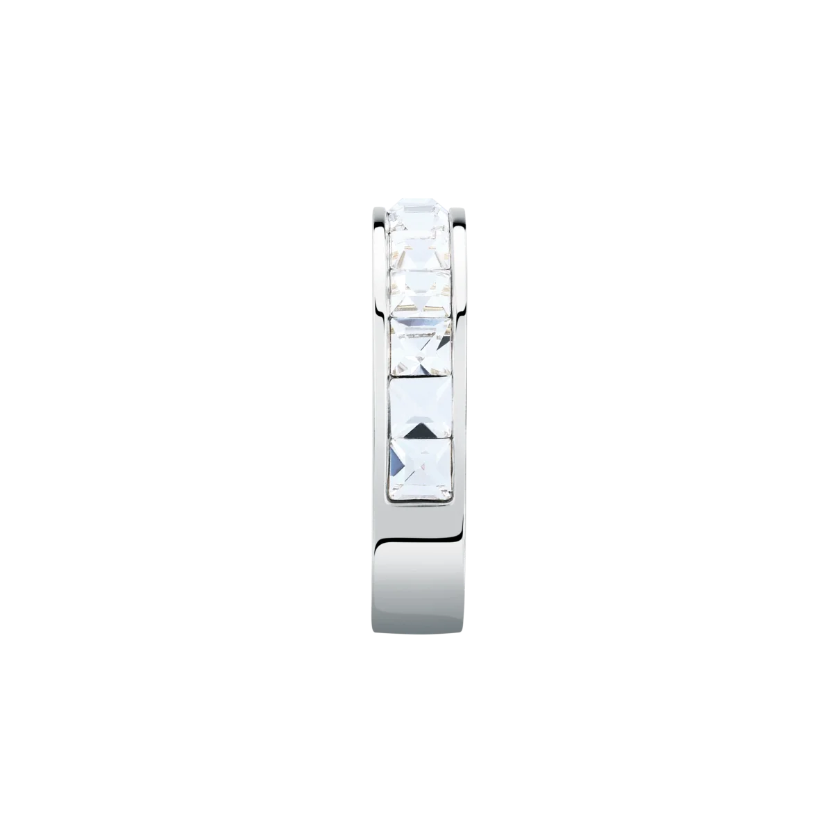 Дамският пръстен Karl Lagerfeld Crystals KLAYC51012 е изчистен тенис дизайн, който обгръща пръста с непрекъснат ред от блясък. Широката, гладко полирана халка от сребриста неръждаема стомана е декорирана по целия обръч с квадратни бели кристали, подредени в канална инкрустация. Резултатът е елегантен, „леден“ ефект, който се забелязва отдалеч.