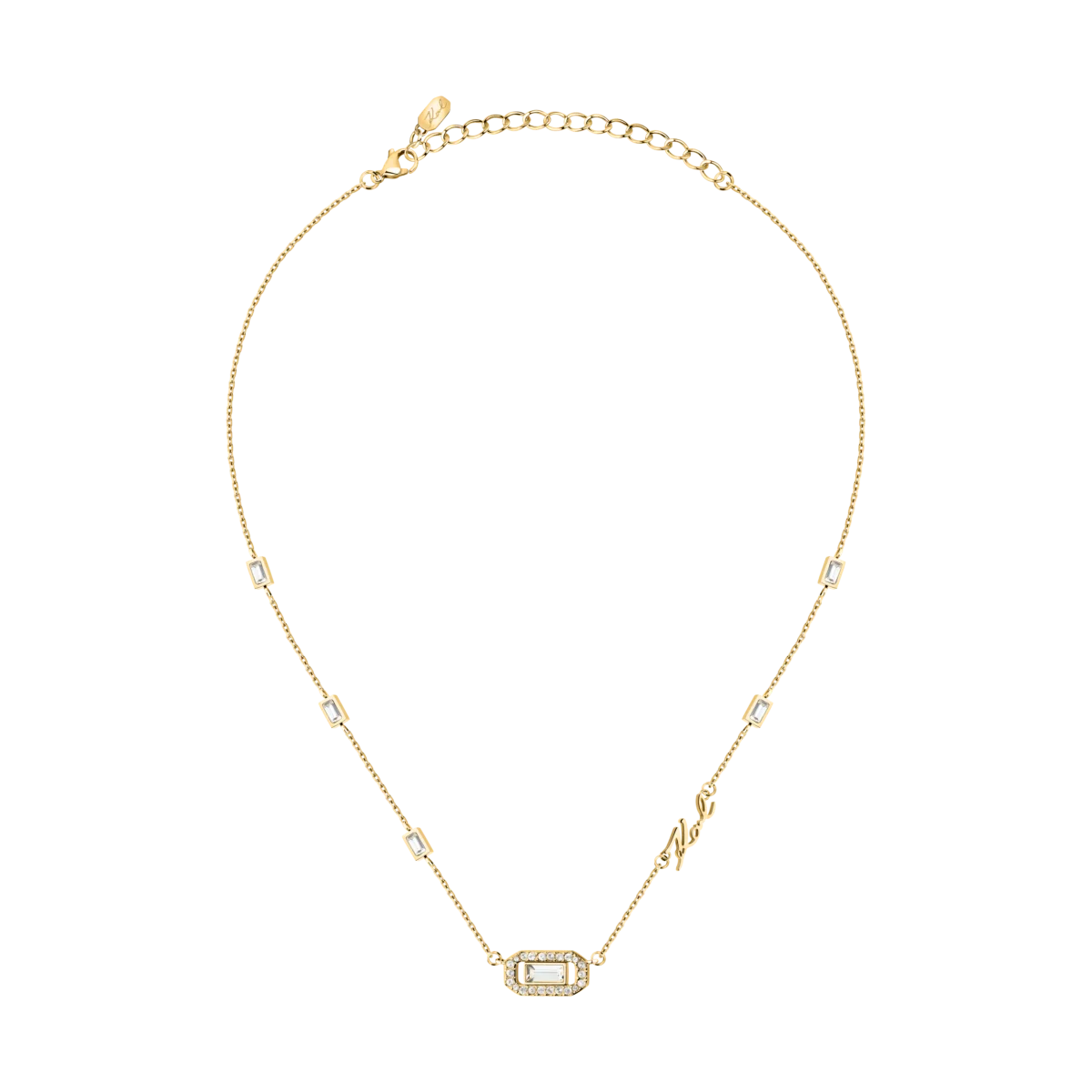 - Дизайн: фина верижка с правоъгълни кристални елементи и овален медальон с паве; страничен надпис „Karl“.