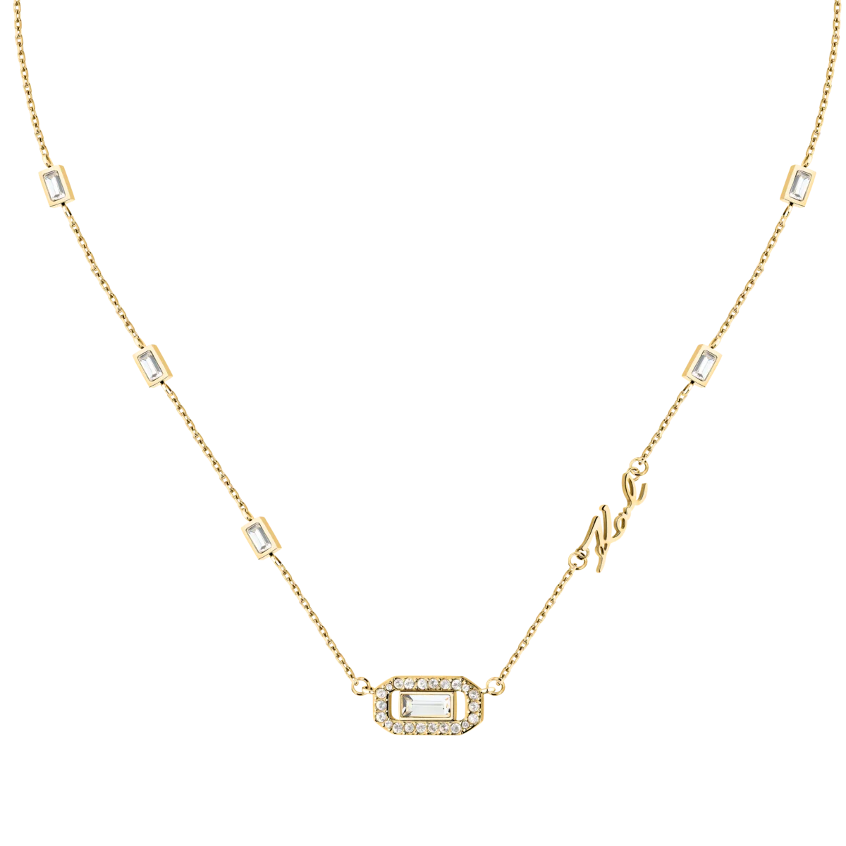 Дамското колие Karl Lagerfeld Crystals KLAYC09 е фин, но забележим акцент, който добавя блясък към всяка визия. Елегантната златиста верижка е изчистена и лека, а по нея са разположени малки правоъгълни елементи с бели кристали цирконий, които водят погледа към централния медальон.