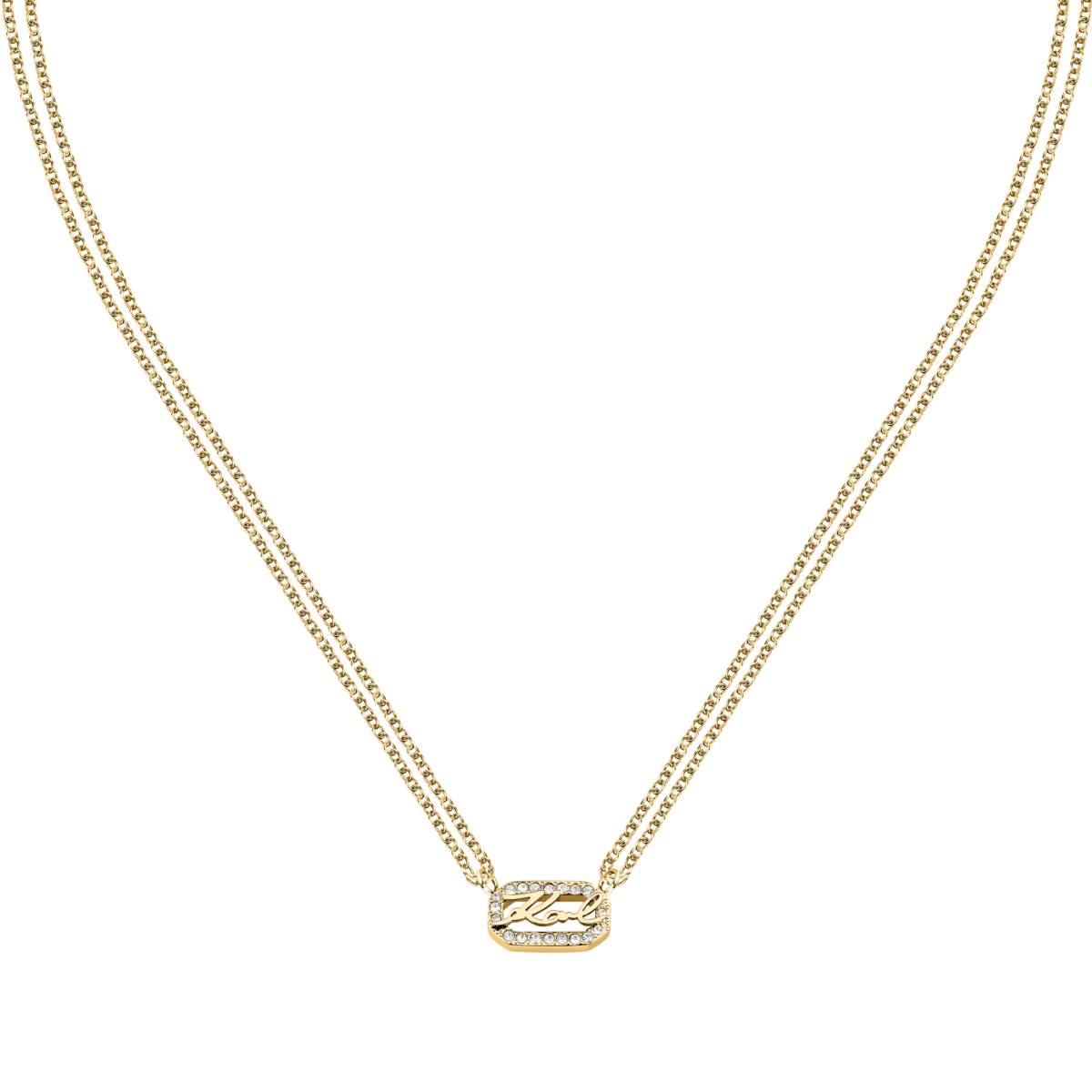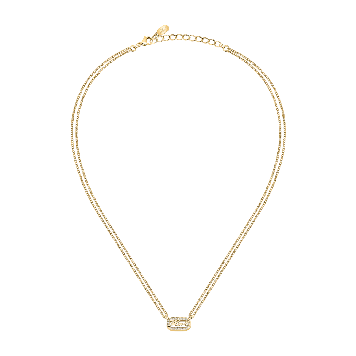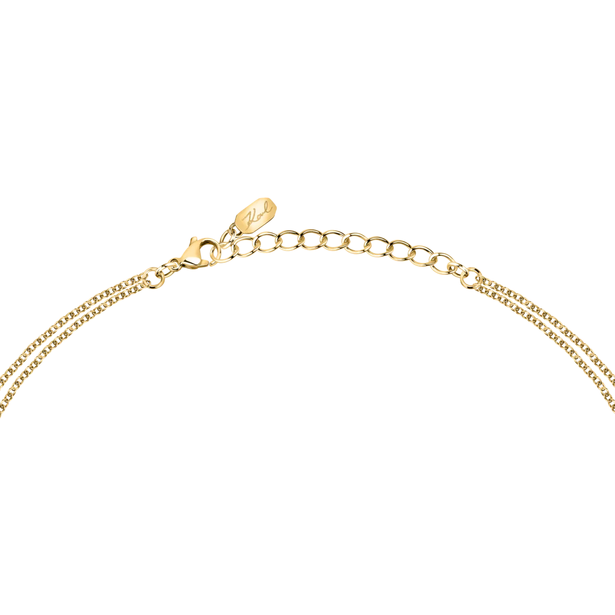 Дамското колие Karl Lagerfeld Crystals KLAYC12 съчетава изчистена линия и бижутериен блясък. Двойната златиста верижка приляга красиво около шията, а в центъра стои правоъгълен елемент с подпис „Karl“, обрамчен от ред излъчващи светлина бели кристали.