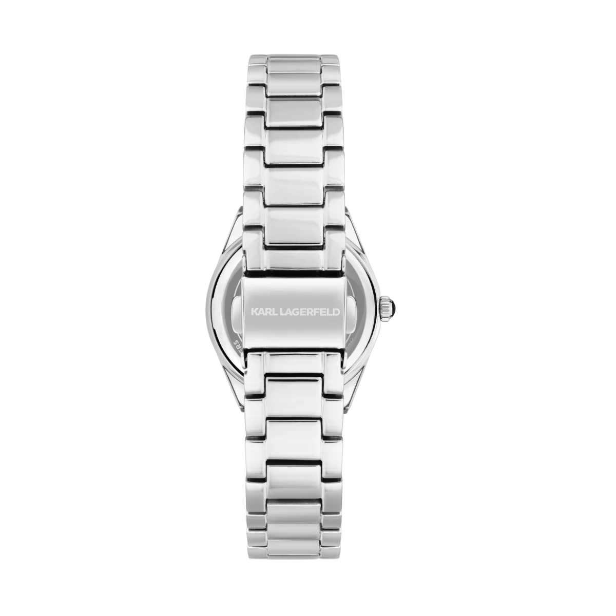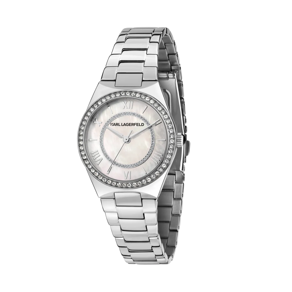 Циферблатът е от естествен бял перлен MOP, който играе с светлината и променя нюансите си от меко бяло до леко опалово. Римските индекси и вътрешният кръг от кристали добавят класическа нотка, а логото Karl Lagerfeld и елегантните стрелки завършват изчистената визия. Над него е поставено минерално стъкло, устойчиво на ежедневни надрасквания.