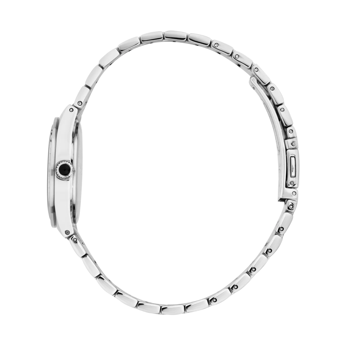 Корпусът и верижката са изработени от неръждаема стомана 316L с полирано сребристо покритие – хипоалергенен и устойчив на корозия материал, подходящ за всекидневно носене. Верижката със сгъваща се закопчалка с бутони приляга сигурно на китката и може лесно да бъде скъсена при нужда.