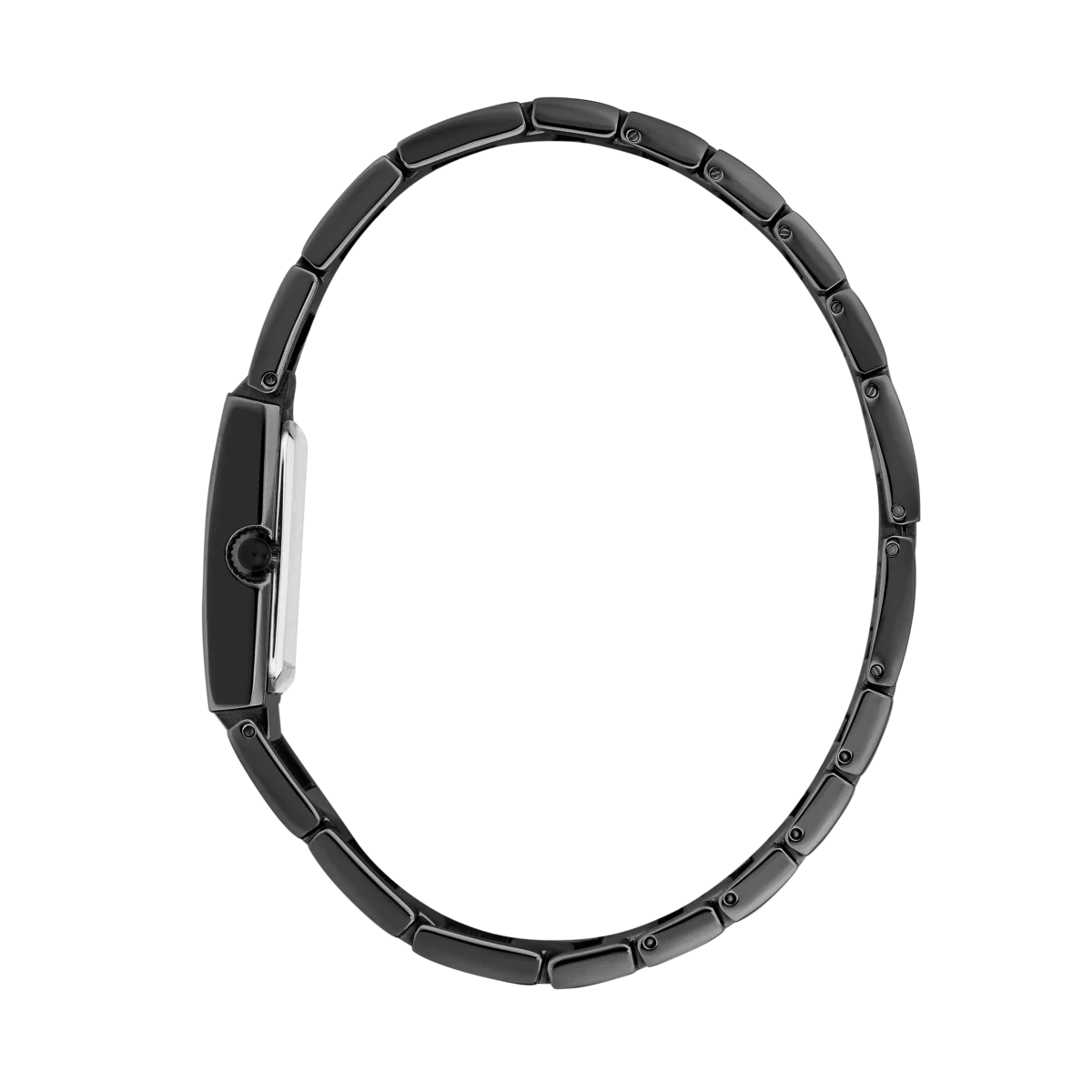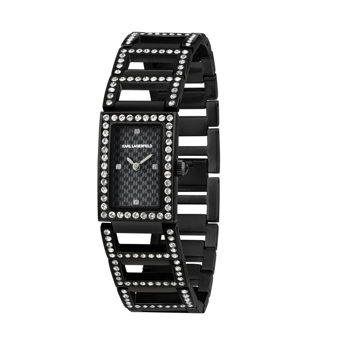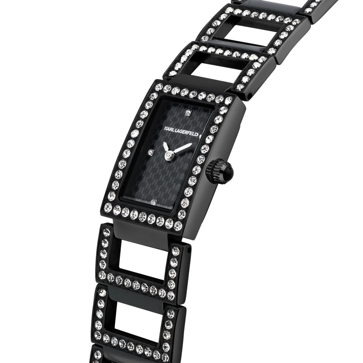Дамският часовник KARL LAGERFELD Paris е създаден като изящна бижутерийна гривна, която едновременно показва време и подчертава стила. Тънкият правоъгълен корпус и отворените елементи на гривната са обрамчени с редица блестящи кристали, които улавят светлината при всяко движение.
