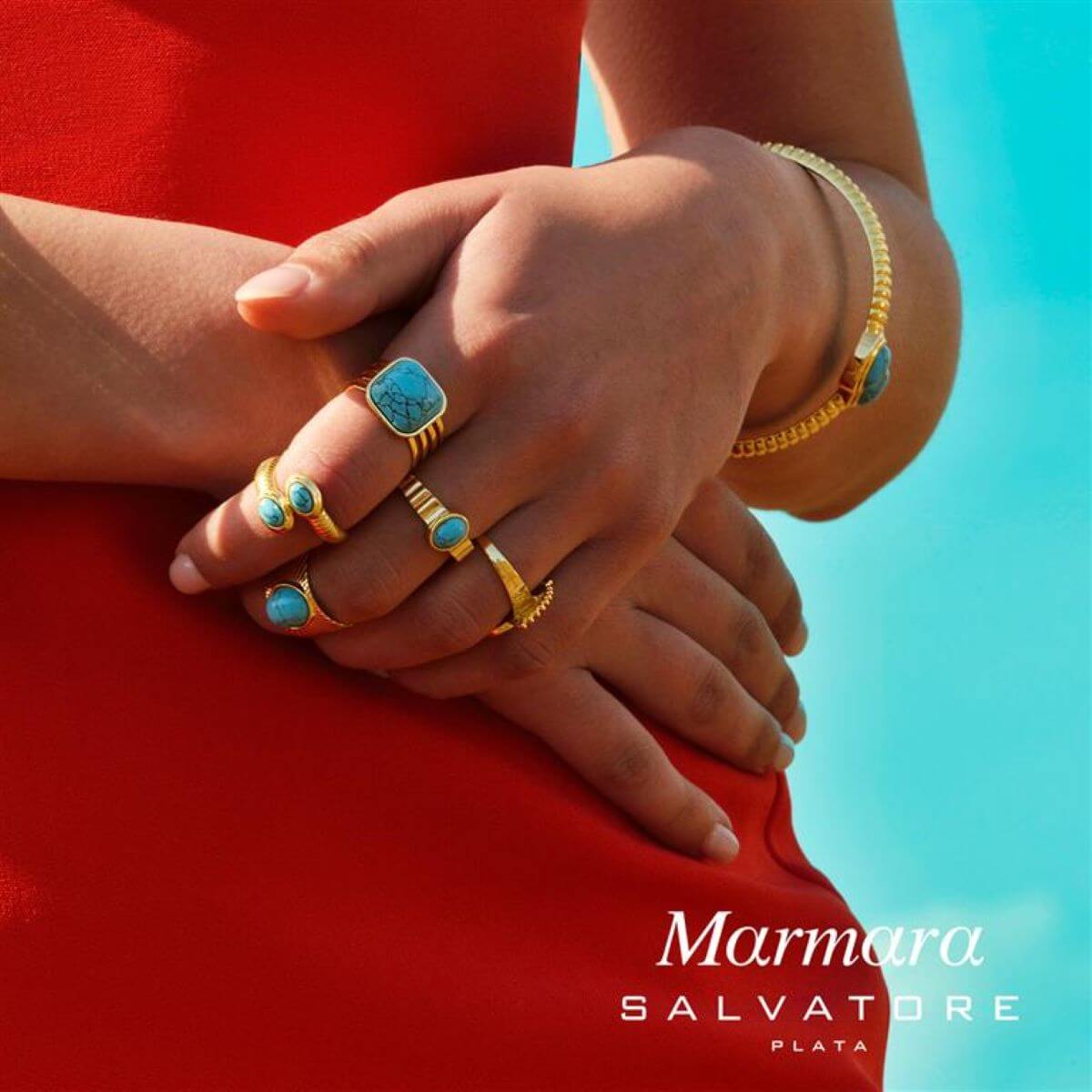 Дамски пръстен с тюркоазен камък и златно PVD покритие 18K – Salvatore Plata MARMARA, носен на ръка.