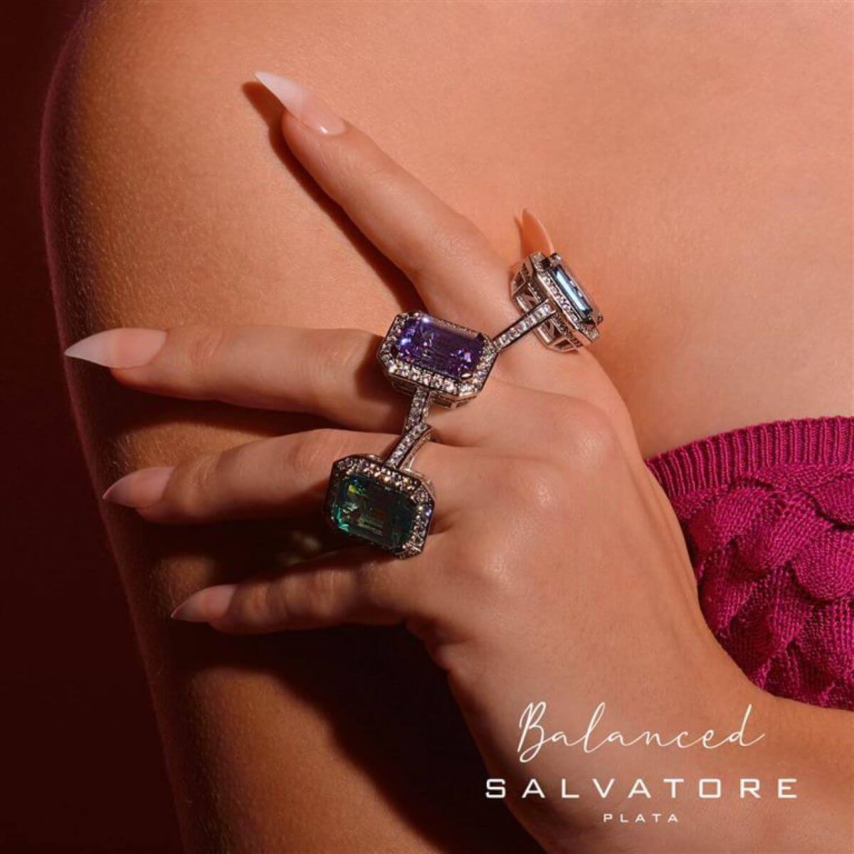 Дамски сребърен пръстен с лавандулов камък, цирконии и родиево покритие Salvatore Plata BALANCED – носен на ръка.