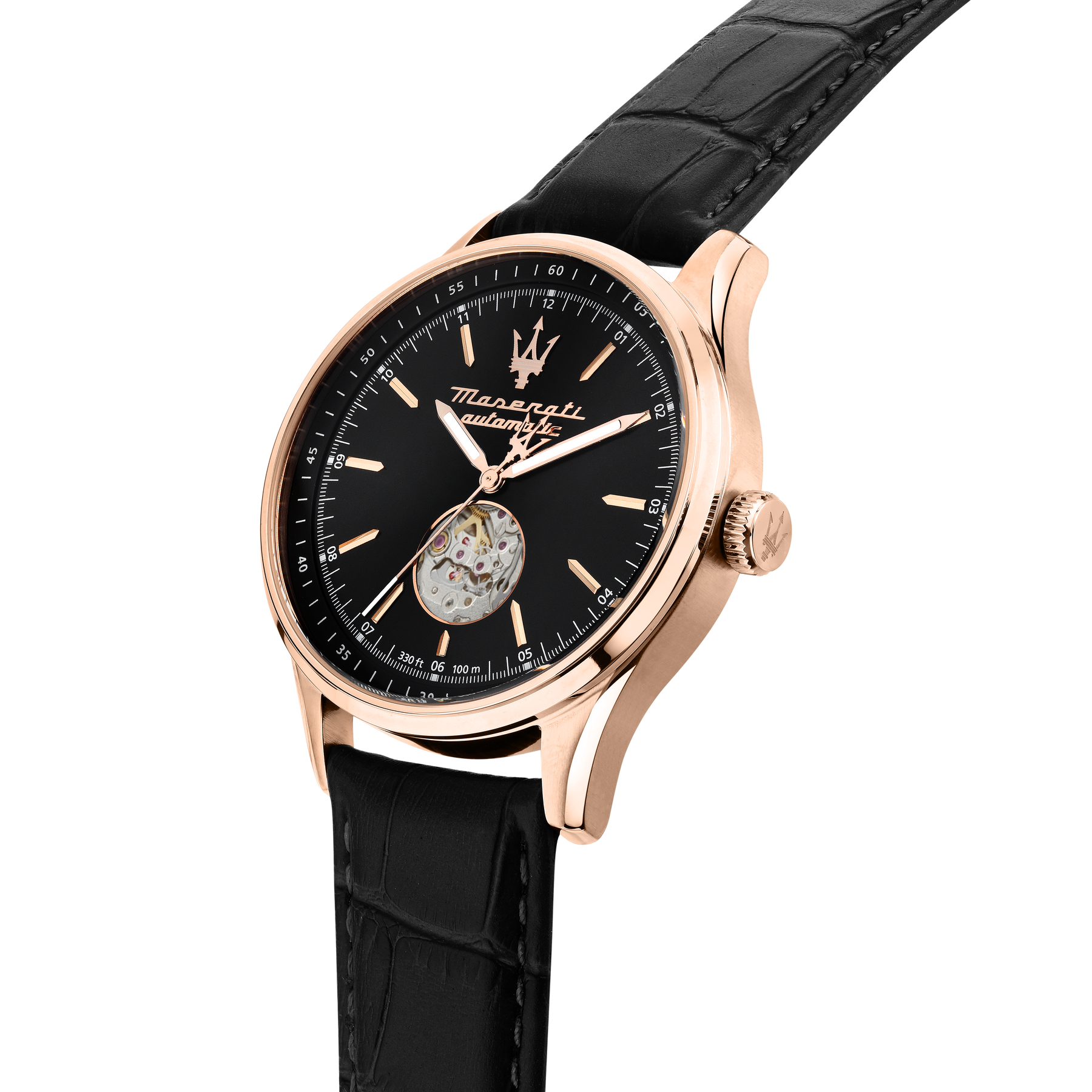 Ανδρικό ρολόι Maserati Epoca, που συνδυάζει κομψό σχεδιασμό και υψηλής ποιότητας κατασκευή. Εξοπλισμένο με αυτόματο μηχανισμό SEIKO NH39, αυτό το μοντέλο προσφέρει ακρίβεια και αντοχή. Η ατσάλινη θήκη με ροζ χρυσό PVD επίστρωμα και διάμετρο 42 χιλιοστά προσδίδει εκλεπτυσμένη εμφάνιση. Η μαύρη πρόσοψη με παράθυρο που αποκαλύπτει τον εσωτερικό μηχανισμό, τονίζει την πολυπλοκότητα και την τέχνη του ρολογιού. Η λωρίδα από φυσικό δέρμα εξασφαλίζει άνεση και στυλ κατά τη διάρκεια της χρήσης. Το ορυκτό γυαλί και η αδιαβροχοποίηση έως 10 ATM καθιστούν αυτό το μοντέλο κατάλληλο για καθημερινή χρήση και πιο ειδικές περιπτώσεις. Το ρολόι έρχεται με διετή εγγύηση, που διασφαλίζει ποιότητα και αξιοπιστία.