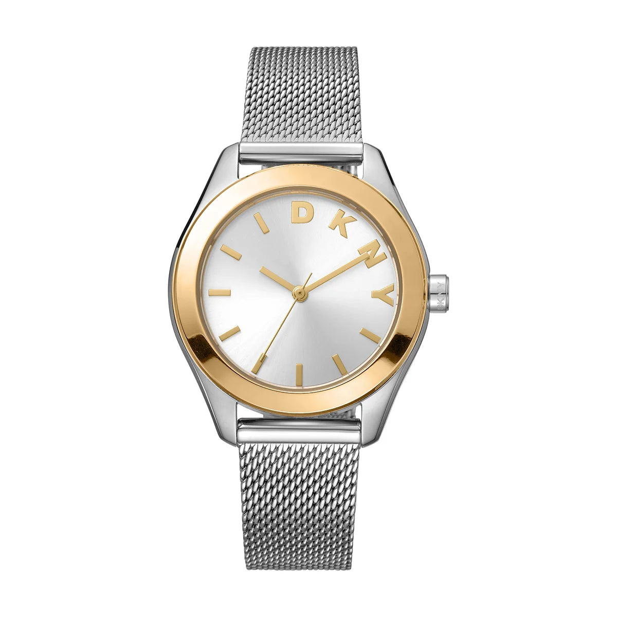 Дамски часовник DKNY Astoria Logo, двуцветна стомана – сребрист циферблат и златист безел, мрежеста верижка, часовник DKNY модел DK1L032M0045