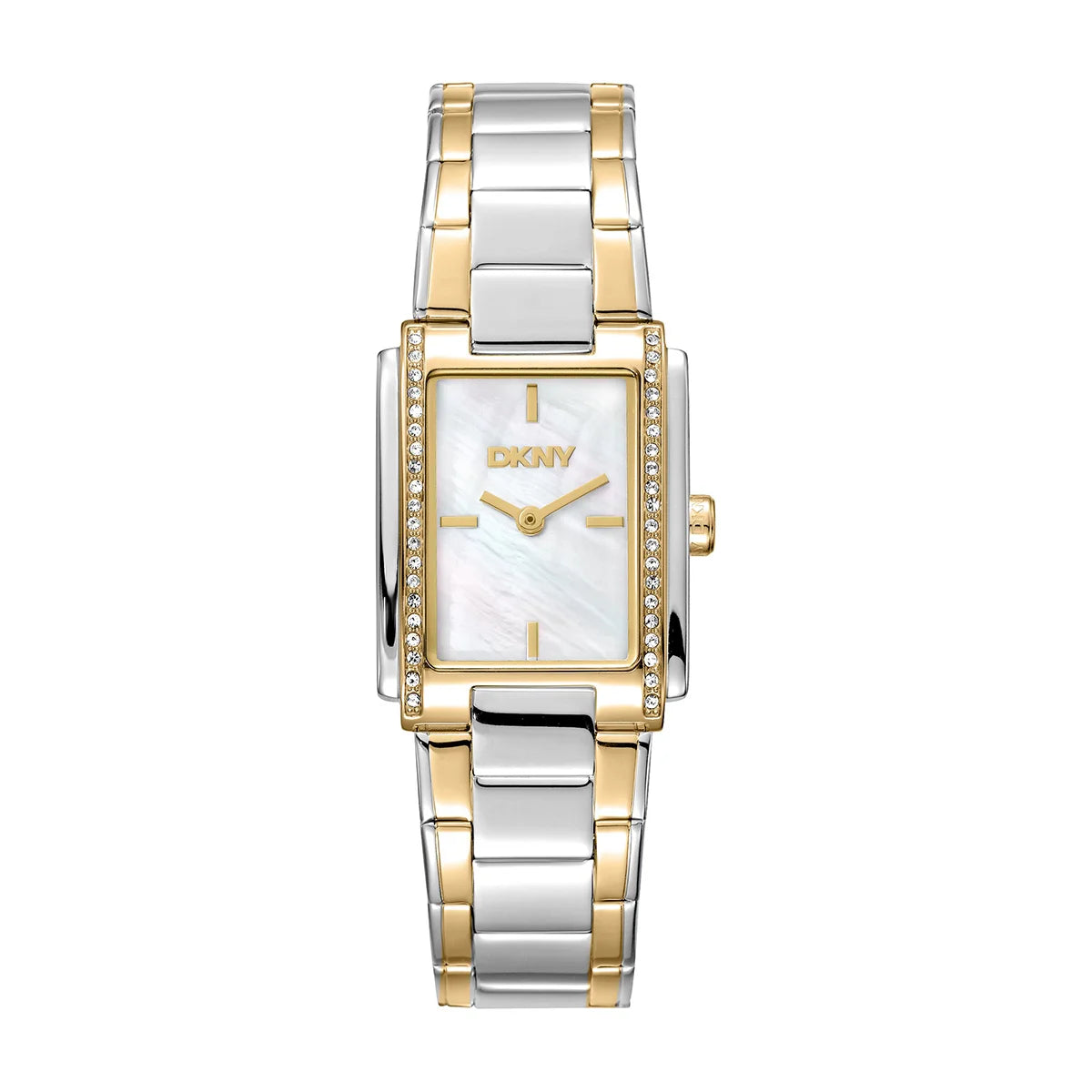 Women's watch DKNY Evening – elegant rectangular silhouette 23×30 mm with delicate crystals on the case. The two-tone bracelet (silver/gold) and pearl dial (White MOP) give a jewelry elegance that easily matches both casual and evening looks.