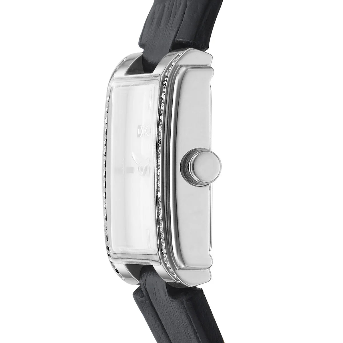 Дамски часовник DKNY – страничен профил на тънък правоъгълен корпус в сребрист тон, модел DK1L122L0015