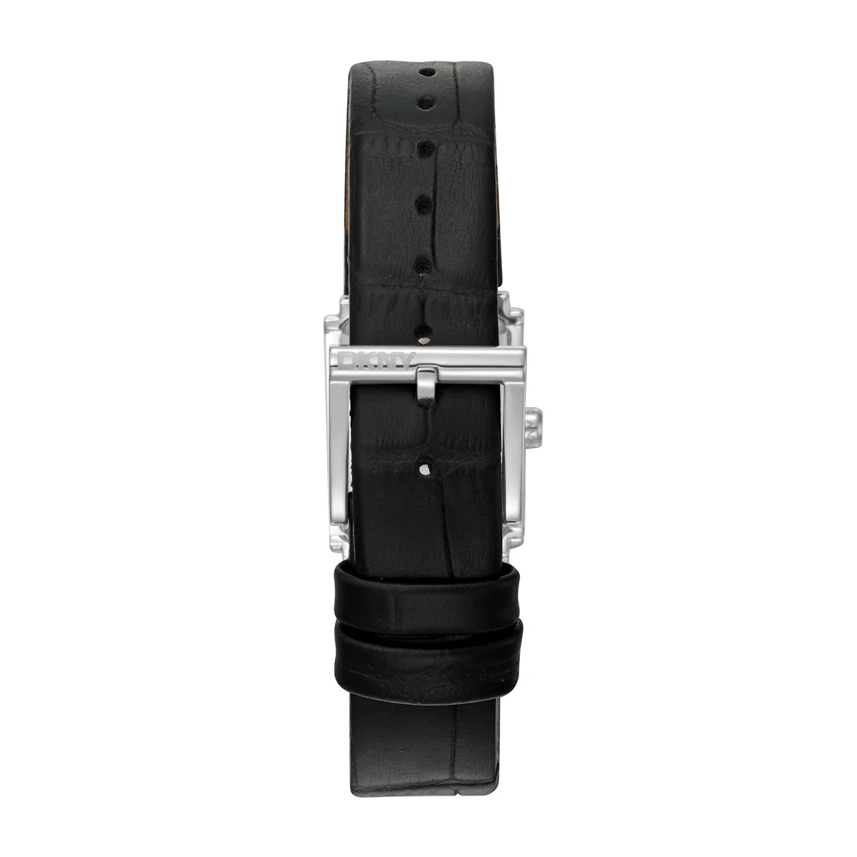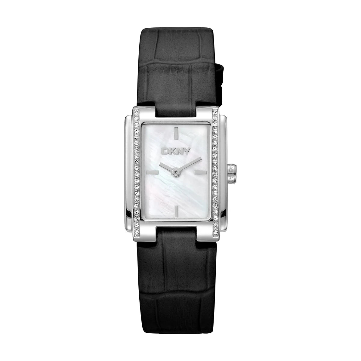 Elegant women's watch DKNY in a clean rectangular shape – a delicate jewelry look for every day and occasion. The model impresses with a white mother-of-pearl dial (Mother of Pearl) that softly shimmers in the light, and a black leather strap with a classic buckle.