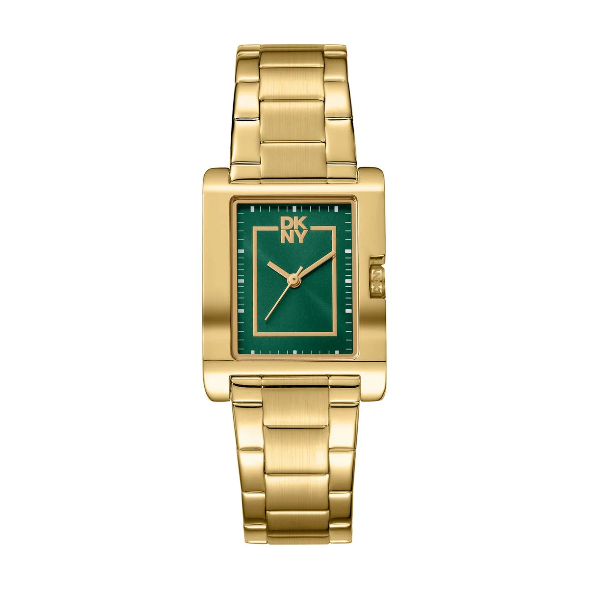Urban chic in a compact form. Westside Midi impresses with a rectangular silhouette, polished lines, and a deep dark green dial that looks sophisticated both during the day and at night. The case and bracelet are made of stainless steel with a gold IP coating – wear-resistant and created for long-lasting shine. The mineral glass protects the clean look of the dial, and the precise Japanese Seiko VJ21 quartz movement ensures reliable timekeeping. The folding clasp guarantees a secure and comfortable fit. Water resistance is 3 ATM – suitable for everyday use, resistant to splashes and hand washing; it is not intended for swimming or showering. If you are looking for an elegant DKNY women's watch that effortlessly combines fashion and functionality, this model is an excellent choice – and an ideal gift for lovers of modern minimalist aesthetics. Key data: - Case: 25.5 × 33.5 mm; thickness 6.75 mm - Material: stainless steel, gold IP coating - Dial: dark green; mineral glass - Movement: Seiko VJ21 quartz, 3 hands - Water resistance: 3 ATM (splashes/washing, no swimming) - Bracelet: steel, width 18 × 16 mm; folding clasp - Weight: ~75 g