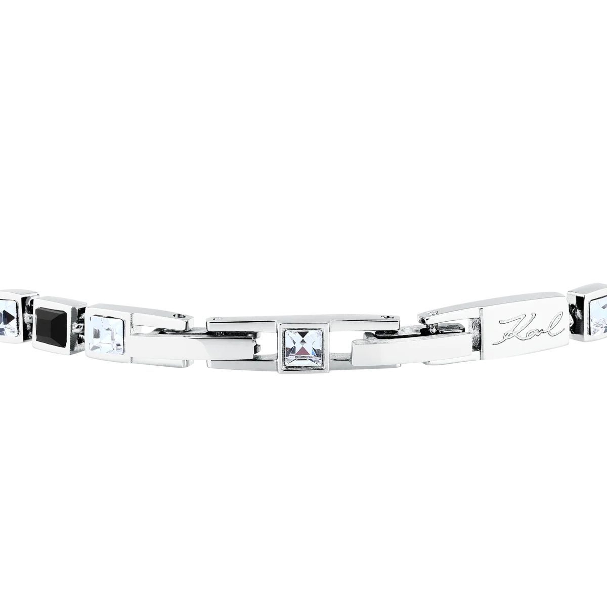 Моделът е изработен от полирана неръждаема стомана 316L в сребрист тон – устойчива на потъмняване и ежедневна употреба. Всяко звено представлява малка метална рамка с фасетиран кристал, а плавните връзки между елементите осигуряват комфорт и свобода на движение. На едно от звената е гравиран подписът Karl, който добавя дискретен дизайнерски акцент.