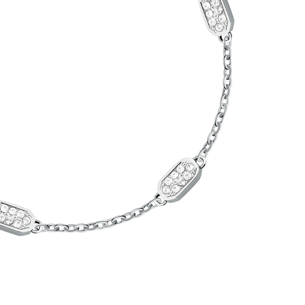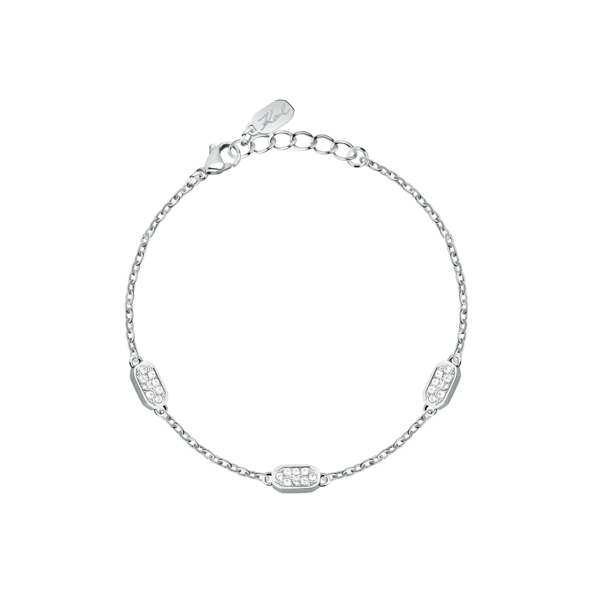 Дамската гривна Karl Lagerfeld Crystals KLAYC65 е фино бижу, което добавя изискан блясък към всяка визия. Нежната верижка от сребриста неръждаема стомана е украсена с три малки правоъгълни елемента, обсипани с прозрачни бели кристали. Резултатът е елегантен, минималистичен силует, който стои еднакво добре самостоятелно или в компанията на часовник.
