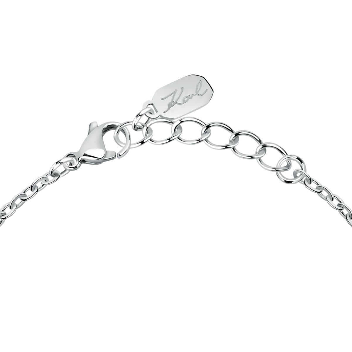 Дължината 17 + 3 см позволява лесно регулиране според обиколката на китката – от около 17 до 20 см. Закопчаването е тип карабинка с удължителна верижка и малка плочка с гравирано лого Karl, което дискретно подсказва дизайнерския произход на бижуто.