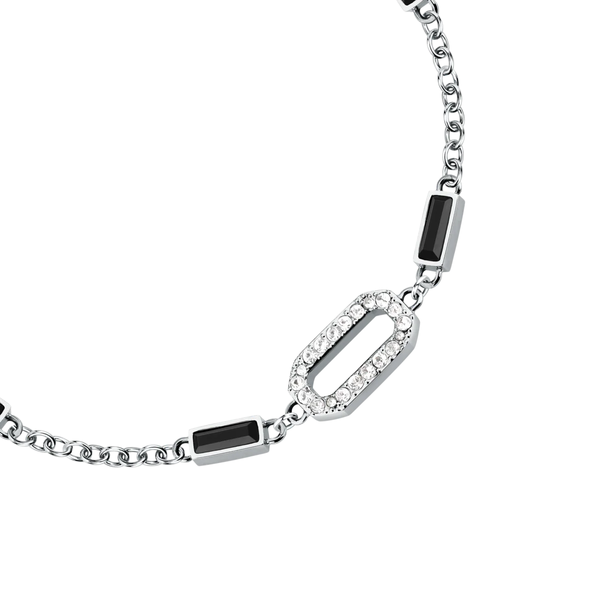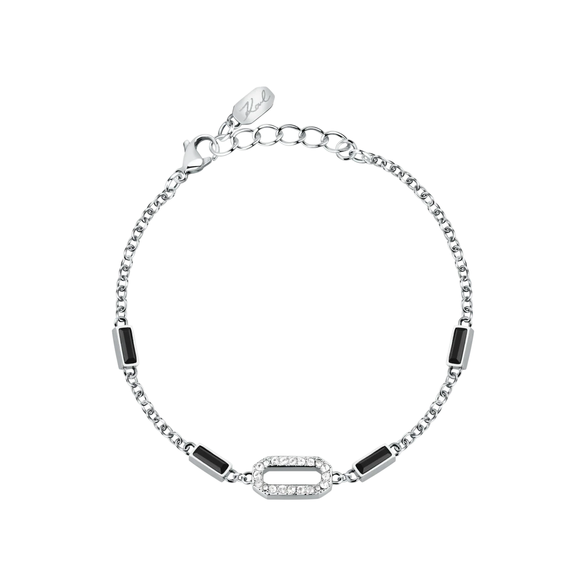 Дамската гривна Karl Lagerfeld Crystals KLAYC21 е изискан тенис акцент за китката, в който минимализъм и блясък се срещат. Фината сребриста верижка е прекъсната от издължени черни кристали, а в центъра изпъква овален елемент с паве от бели кристали, който придава луксозно излъчване на цялото бижу.
