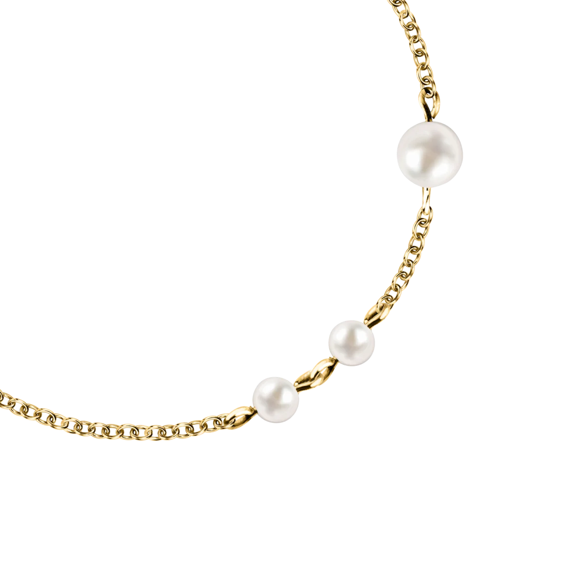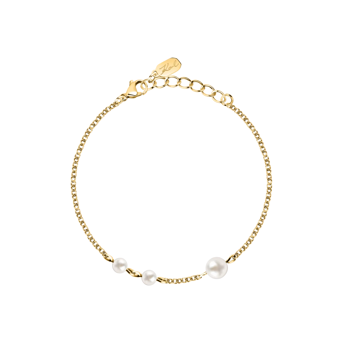 Дамската гривна Karl Lagerfeld Pearl KLAYR20 е фино бижу, което комбинира класиката на перлите с модерната минималистична верижка. Елегантният златист цвят и трите бели перли отпред създават балансиран акцент – достатъчно деликатен за ежедневието и достатъчно ефектен за вечерните излизания.