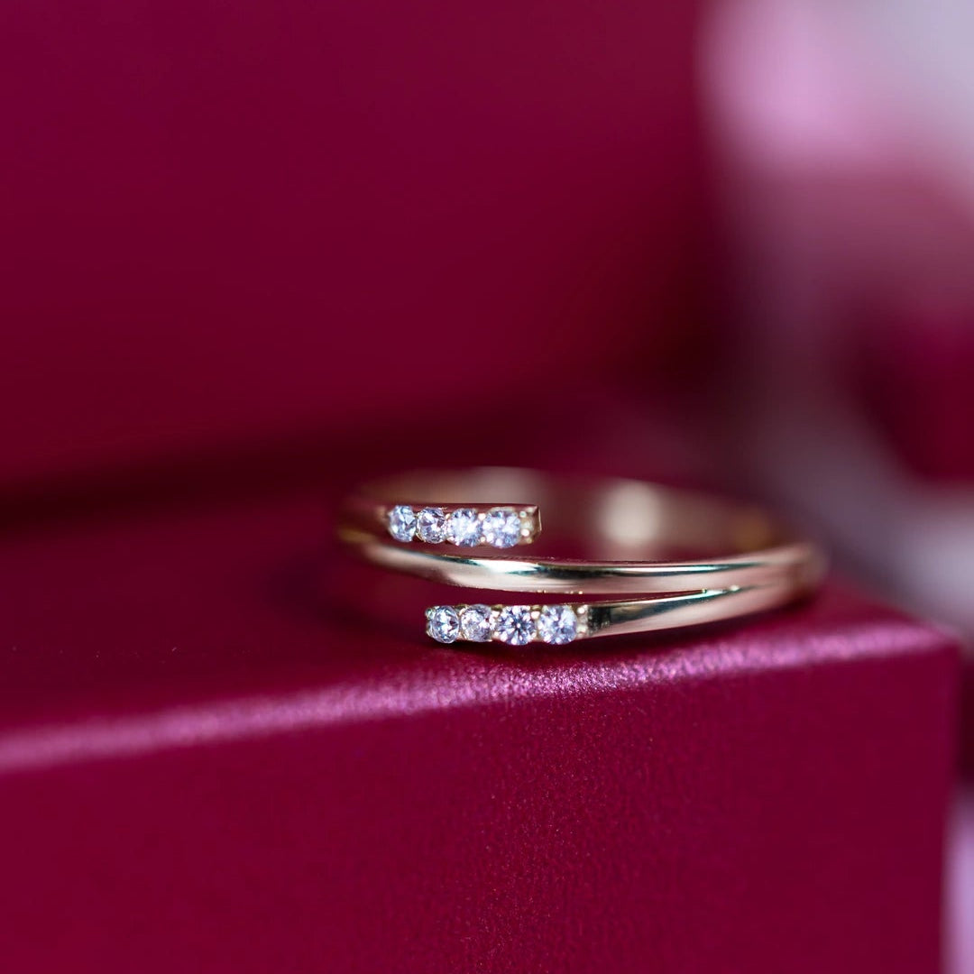 Elegant gold ring, crafted from 14K yellow gold, featuring a delicate band and sparkling embedded zircons. Its design enhances the brilliance of the crystals and imparts a luxurious and beautiful appearance.