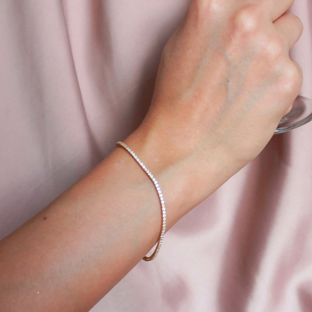 Елегантна тенис гривна в розово злато 14k с изящни циркони, носена на ръка