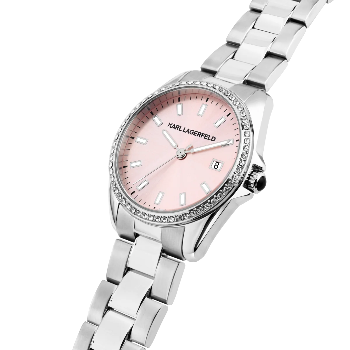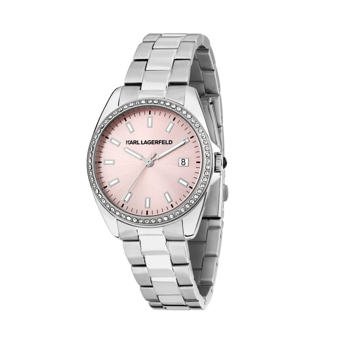 The delicate Karl Lagerfeld Round Essentials women's watch combines the brand's fashionable shine with everyday comfort. The soft pink sunray dial with crystal indices and a date window at 3 o’clock creates a feminine accent that pairs easily with both a suit and a favorite shirt and jeans.