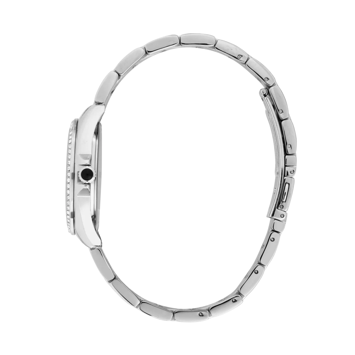 The 35 mm diameter case is made of polished 316L stainless steel in a silver tone – durable, hypoallergenic, and suitable for daily wear. The mineral glass protects the dial from minor scratches, while the thin bezel with a row of fine crystals emphasizes the round shape without making the watch look too heavy.