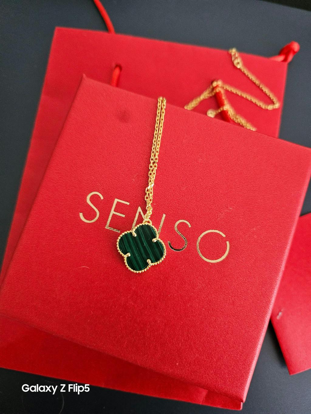 The Senso Silver silver necklace with a clover is made of 925 silver with a gold plating and is inlaid with green Malachite, which gives a refined and elegant look. With a chain length of 40 cm and a 5 cm extender, this necklace is a perfect accessory for everyday wear or special occasions, adding style and sophistication to any look.
