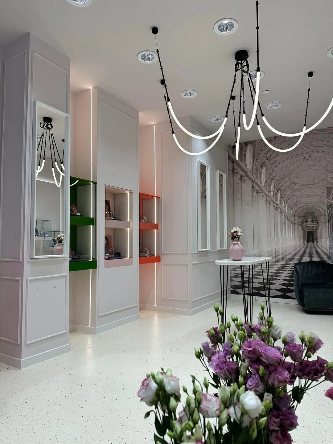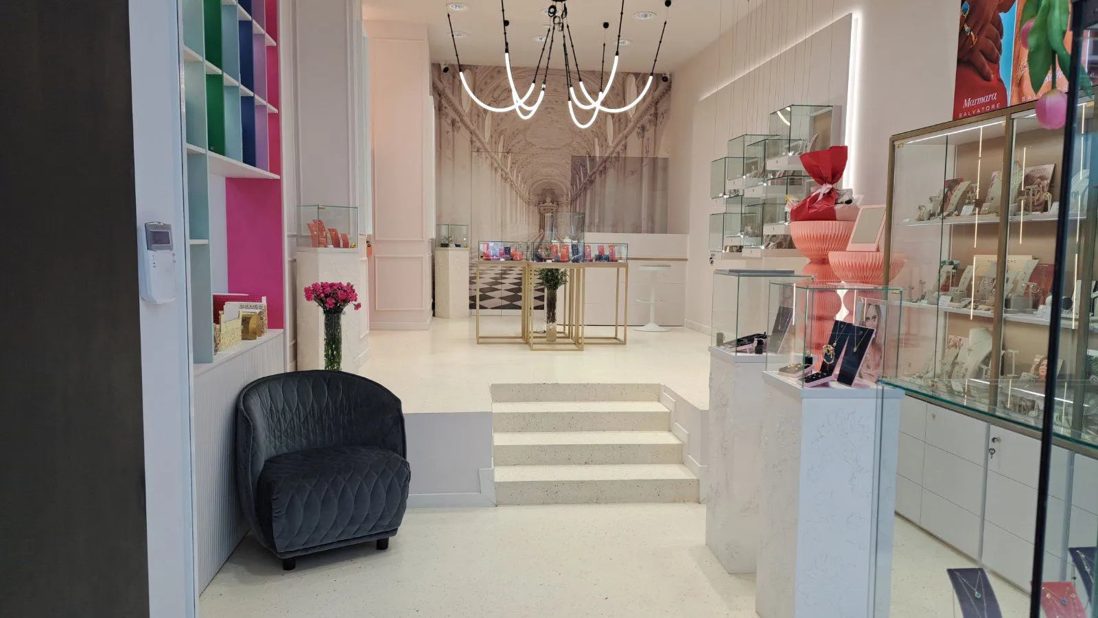 Интериорът комбинира модерна минималистична визия с фини детайли на лукс. В стъклени витрини са изложени изящни модели с диаманти, а специални дисплеи представят актуалните колекции от български и международни дизайнери. Опитните консултанти ще ви помогнат да изберете подходящо бижу, обяснявайки чистотата на металите и концепцията зад всяко изделие.