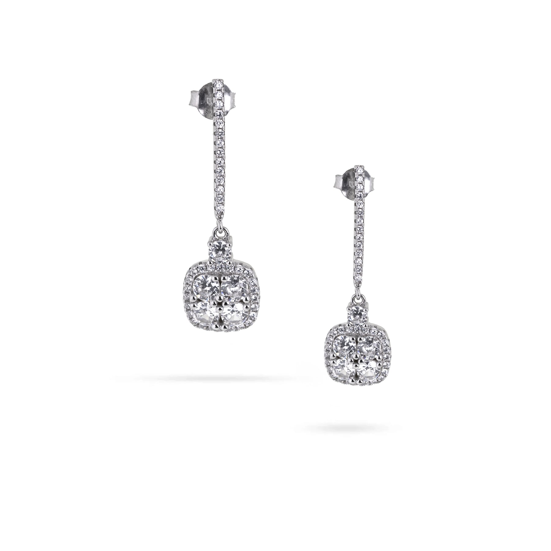 Висящи сребърни обеци с родиево покритие и инркустирани блестящи циркони.