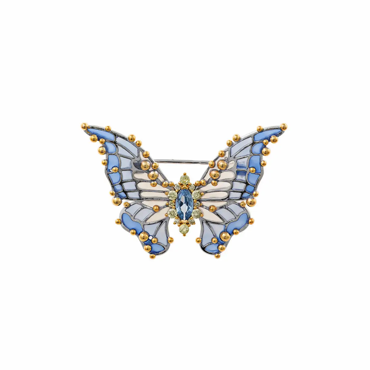Ефектна брошка пеперуда от сребро 925 с позлата, украсена със син емайл, синтетичен син шпинел и жълти циркони – за стилен и артистичен акцент.