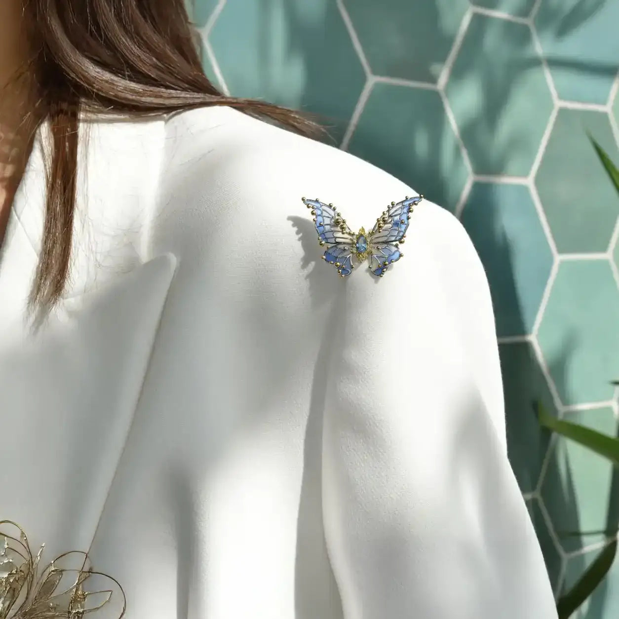 Сребърна брошка пеперуда със син емайл върху сако – лайфстайл визия
