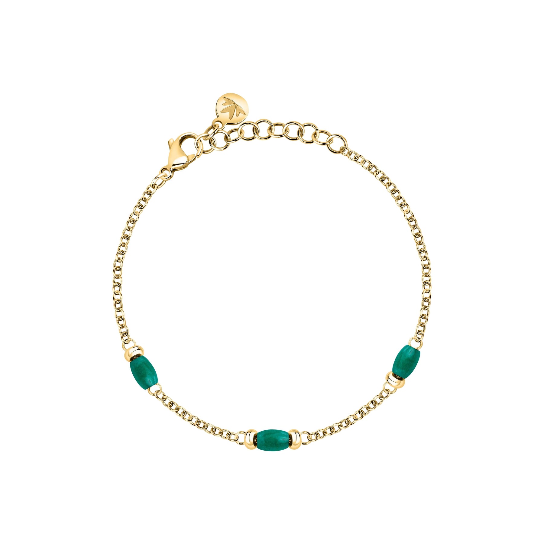 Стилна дамска гривна от стомана със златно PVD покритие, декорирана със зелени цилиндрични елементи. Morellato SAXQ14