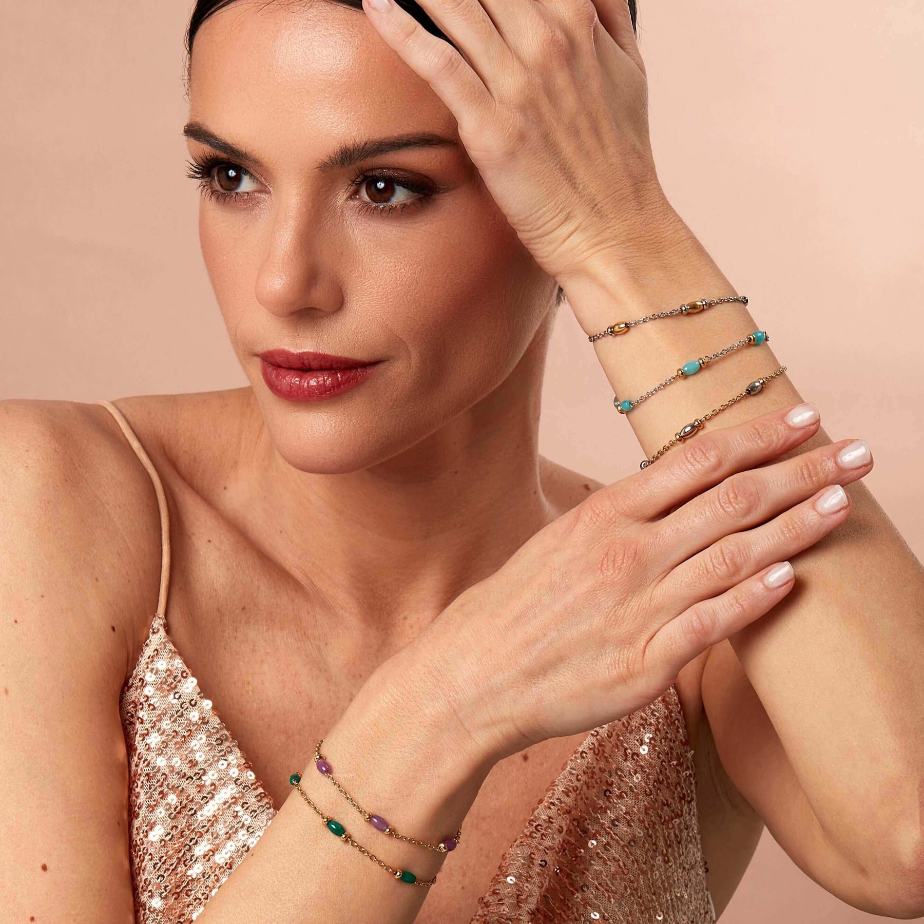 Нежна дамска гривна от колекцията Morellato Colori, изработена от стомана. Украсена със златисти цилиндрични елементи. Тези гривна е перфектният аксесоар, който ще добави блясък и стил към всяка визия.