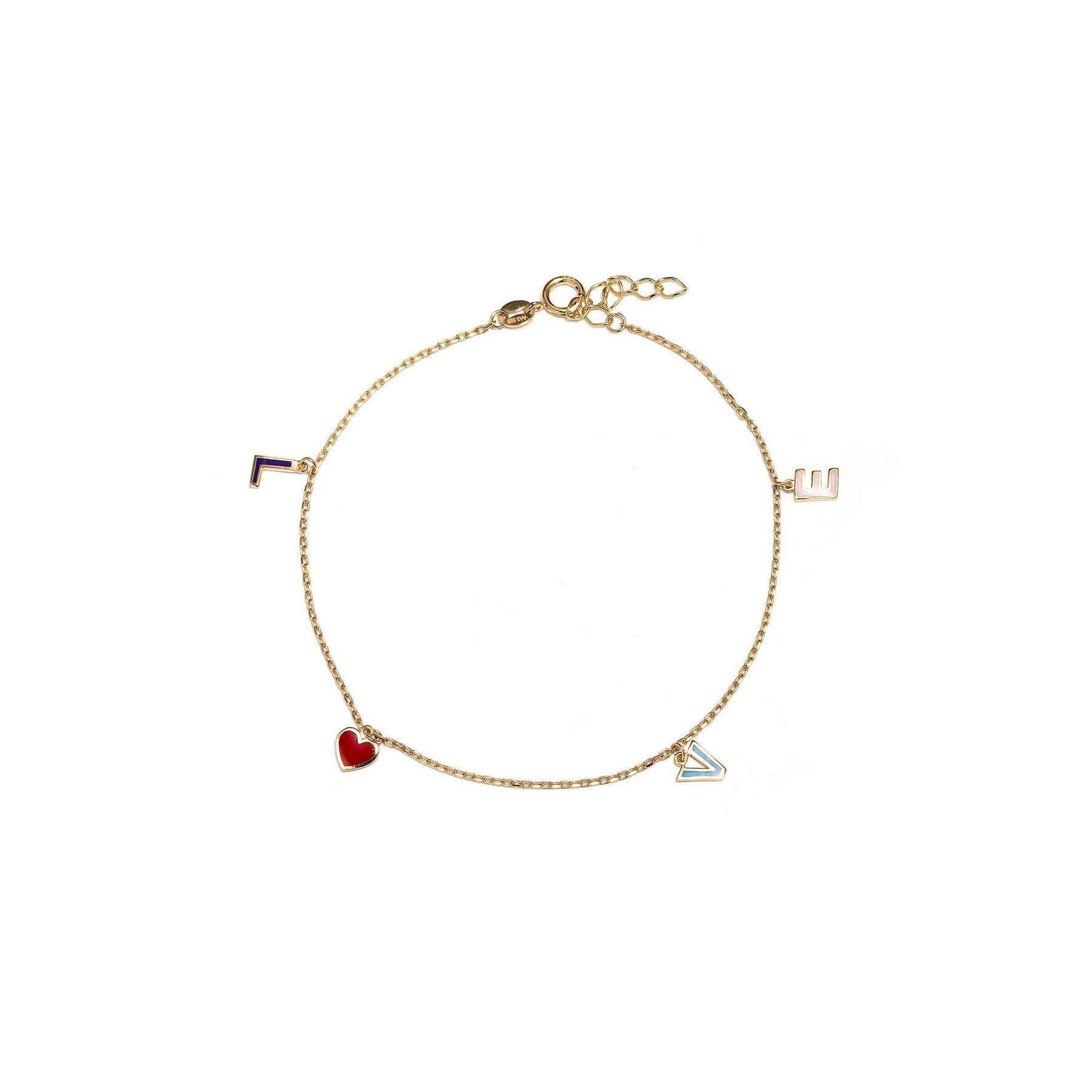 Дамска златна гривна с надпис Love от цветен емайл.