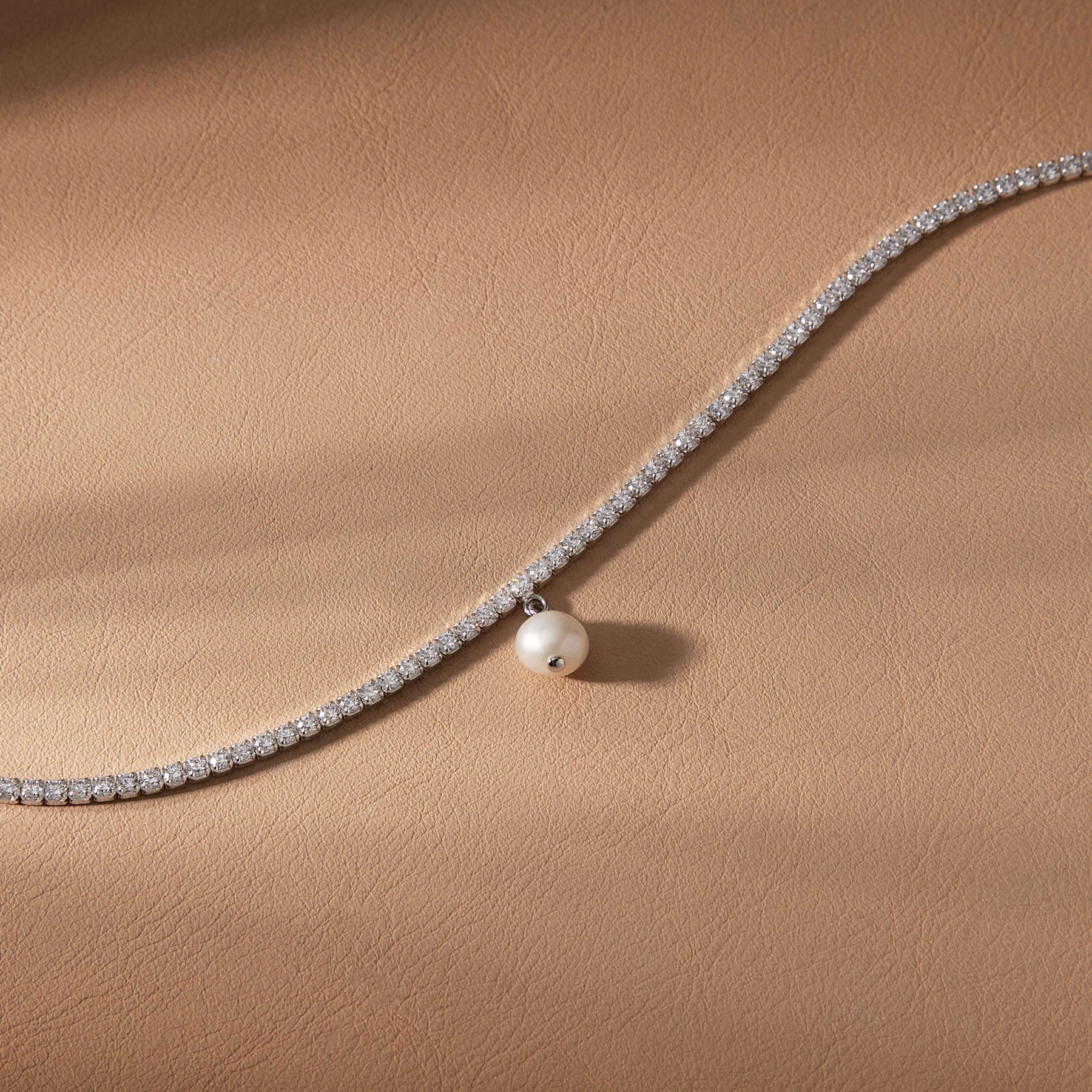 Добавете елегантност и изящество към всяка визия със стилната сребърна тенис гривна с родиево покритие. Моделът е украсен с нежна сладководна перла и блестящи циркони, които символизират чистота, женственост и изтънчен вкус. Финото покритие придава топъл блясък и дълготрайна устойчивост, съчетавайки класика и модерна визия в едно бижу.