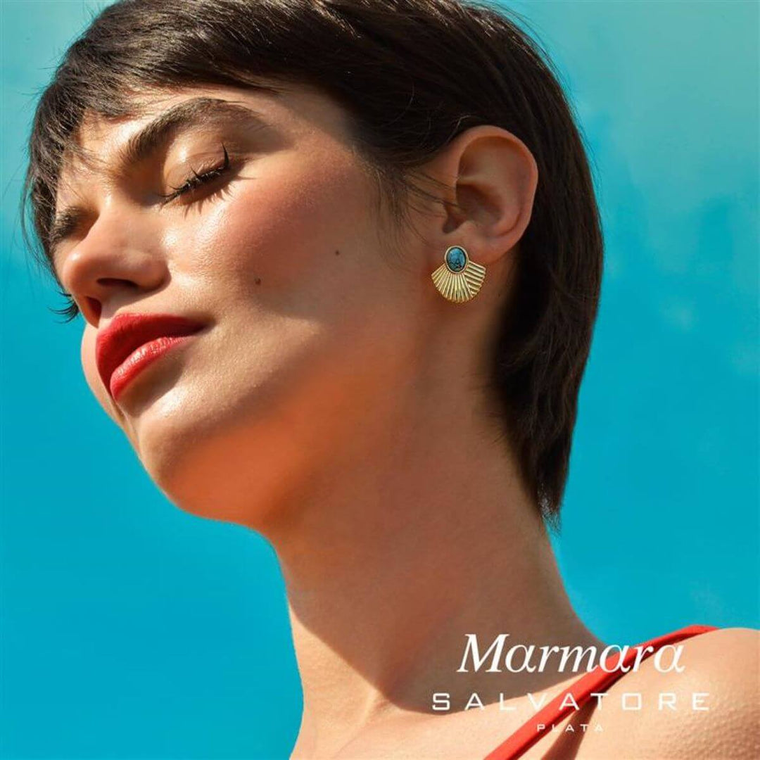 Дамски обеци с винт, тюркоазен камък и златно PVD покритие 18K – Salvatore Plata MARMARA, носени на модел.