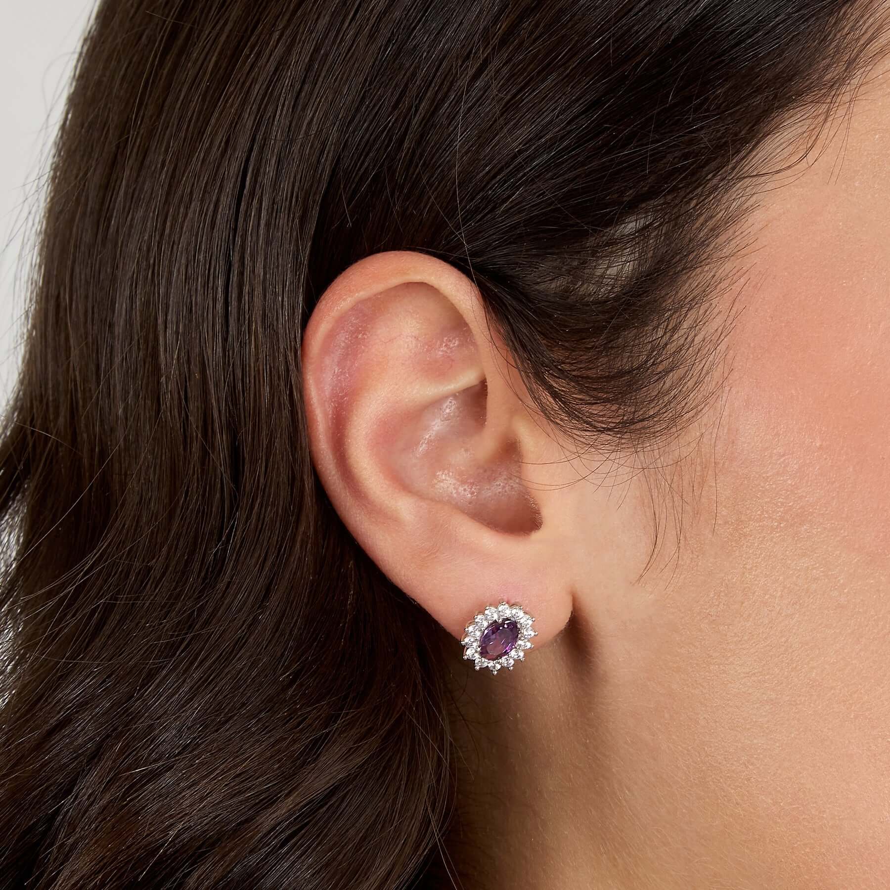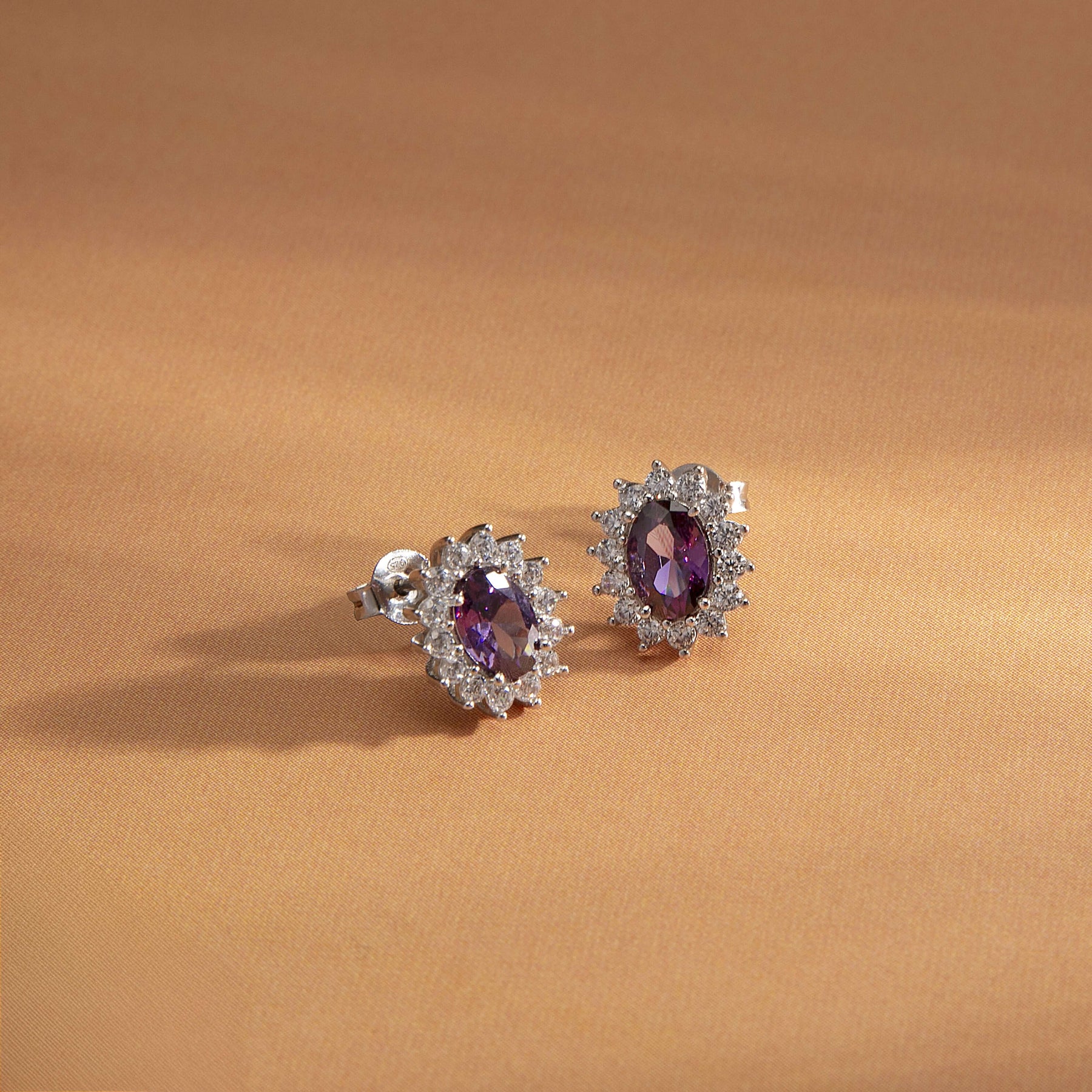 Подчертайте своята елегантност със стилните сребърни обеци с лилави циркони. Централният овален камък в дълбок лилав цвят е обграден от блестящи бели циркони, които създават сияен ореол и придават кралска изисканост.