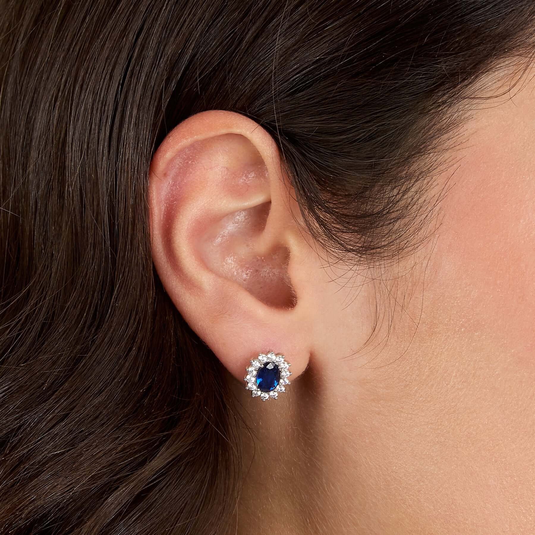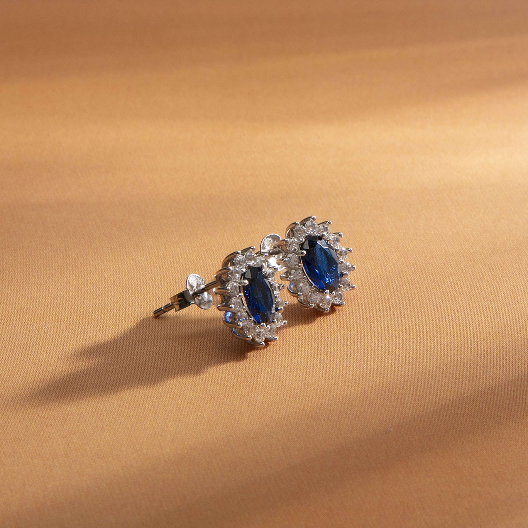 Подчертайте своята елегантност със стилните сребърни обеци със сини циркони. Централният овален камък в дълбок син цвят е обграден от блестящи бели циркони, които създават сияен ореол и придават кралска изисканост.