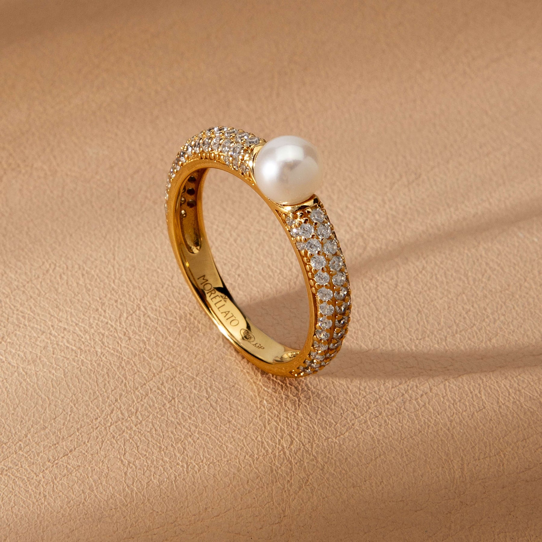 Сребърен дамски пръстен със златно покритие 18к, циркони и перла | Morellato Perla