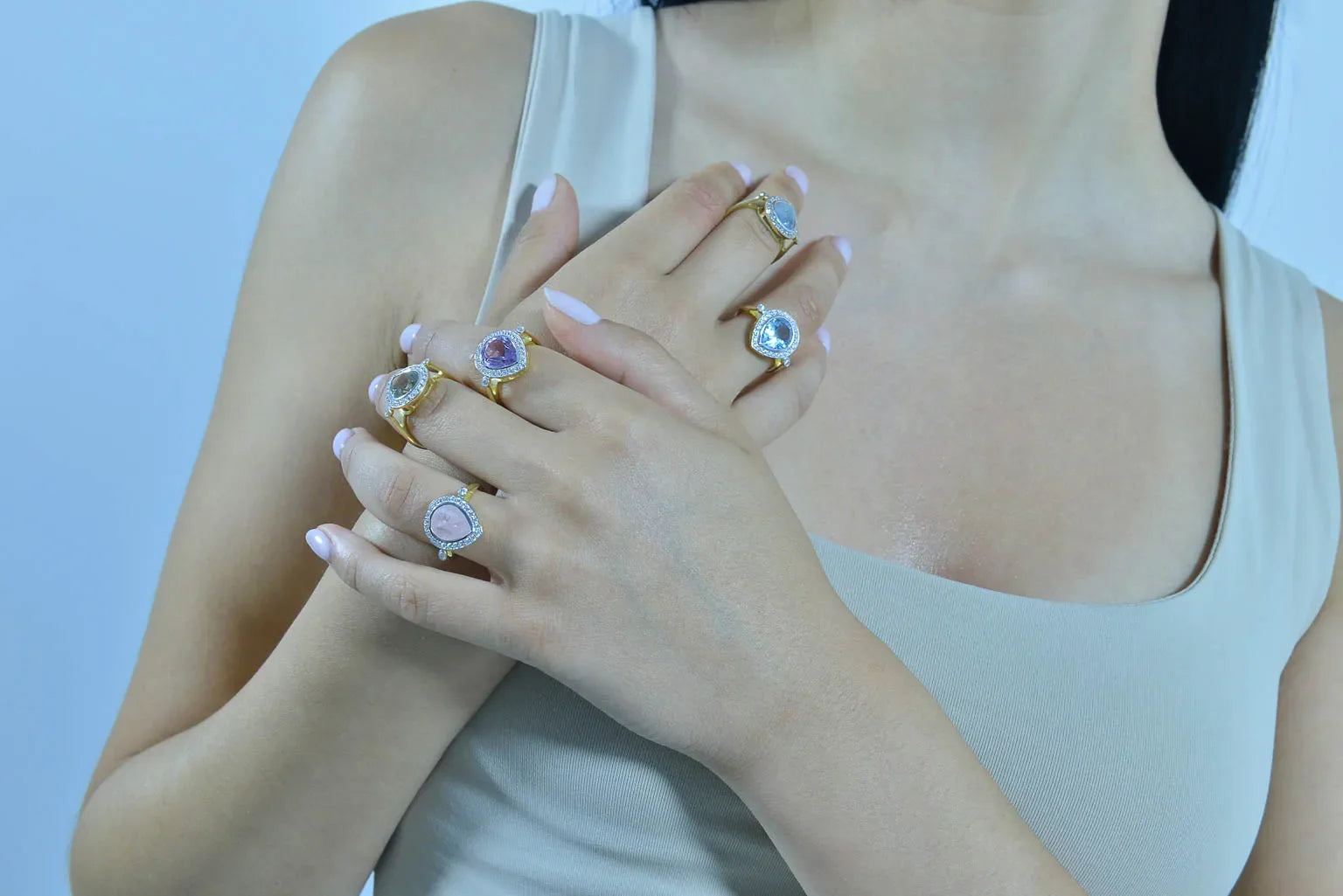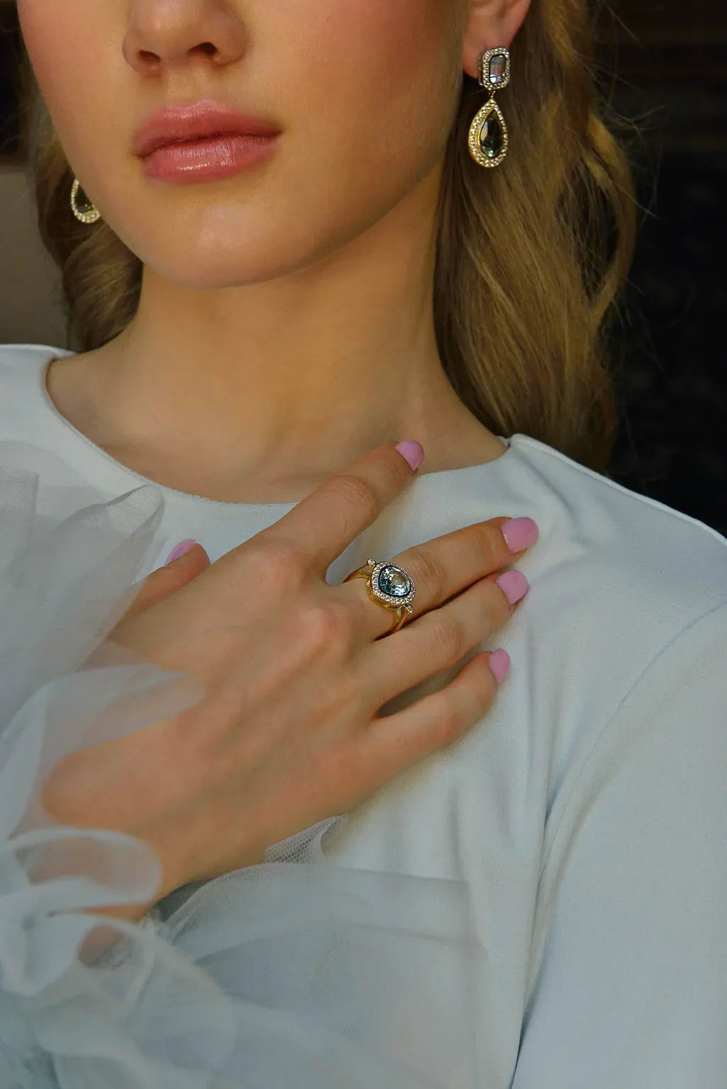 Дамски пръстен Salvatore Plata с топаз, показан на ръка с бижута.