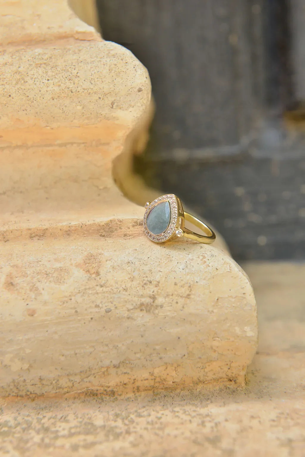 Пръстен Salvatore Plata с топаз, поставен върху текстурирана повърхност.