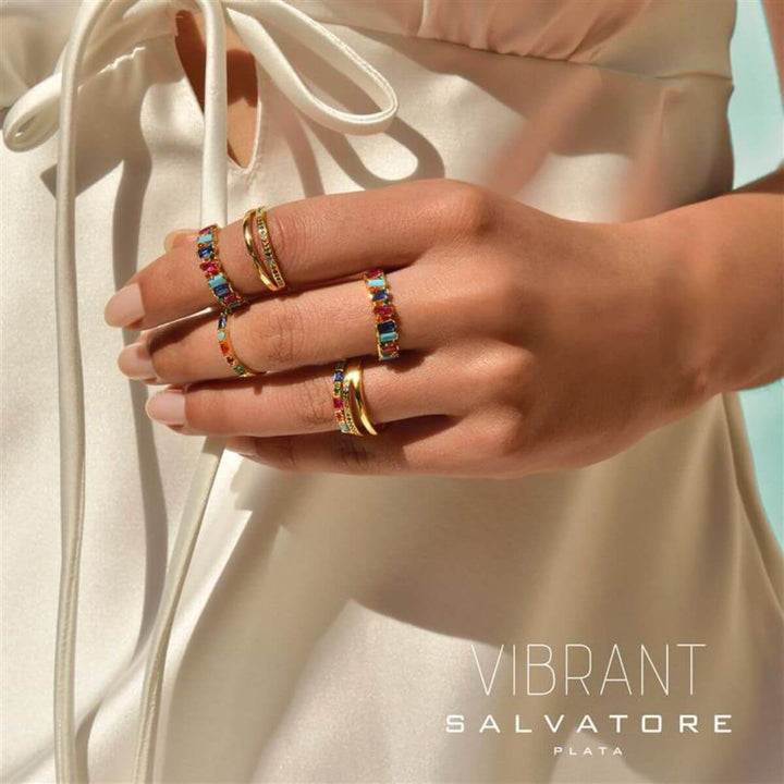 Дамски сребърен пръстен със златно PVD покритие 18K злато и цветни правоъгълни цирконии | Salvatore Plata VIBRANT