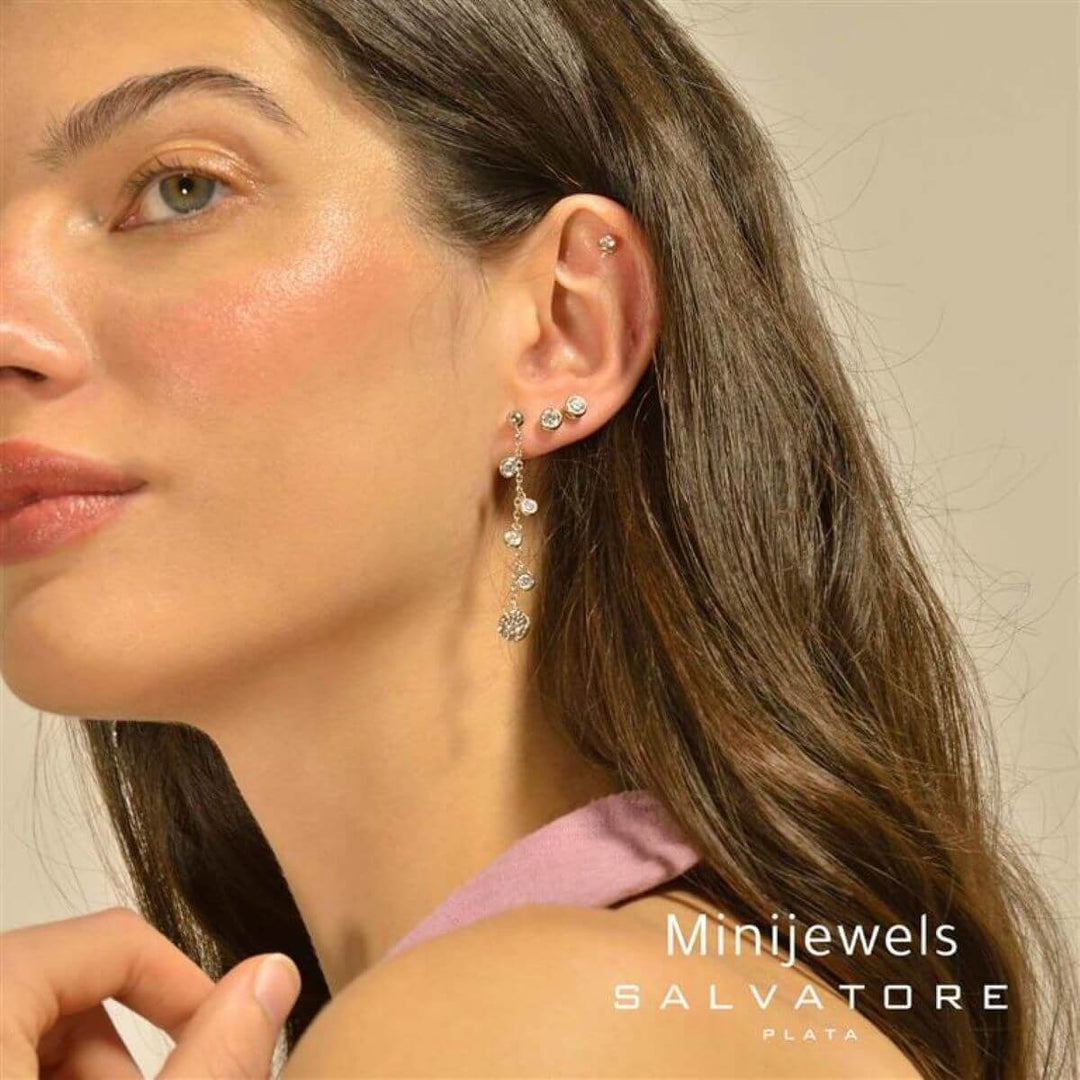 Модел, носещ дамски сребърни обеци с винт и циркон.